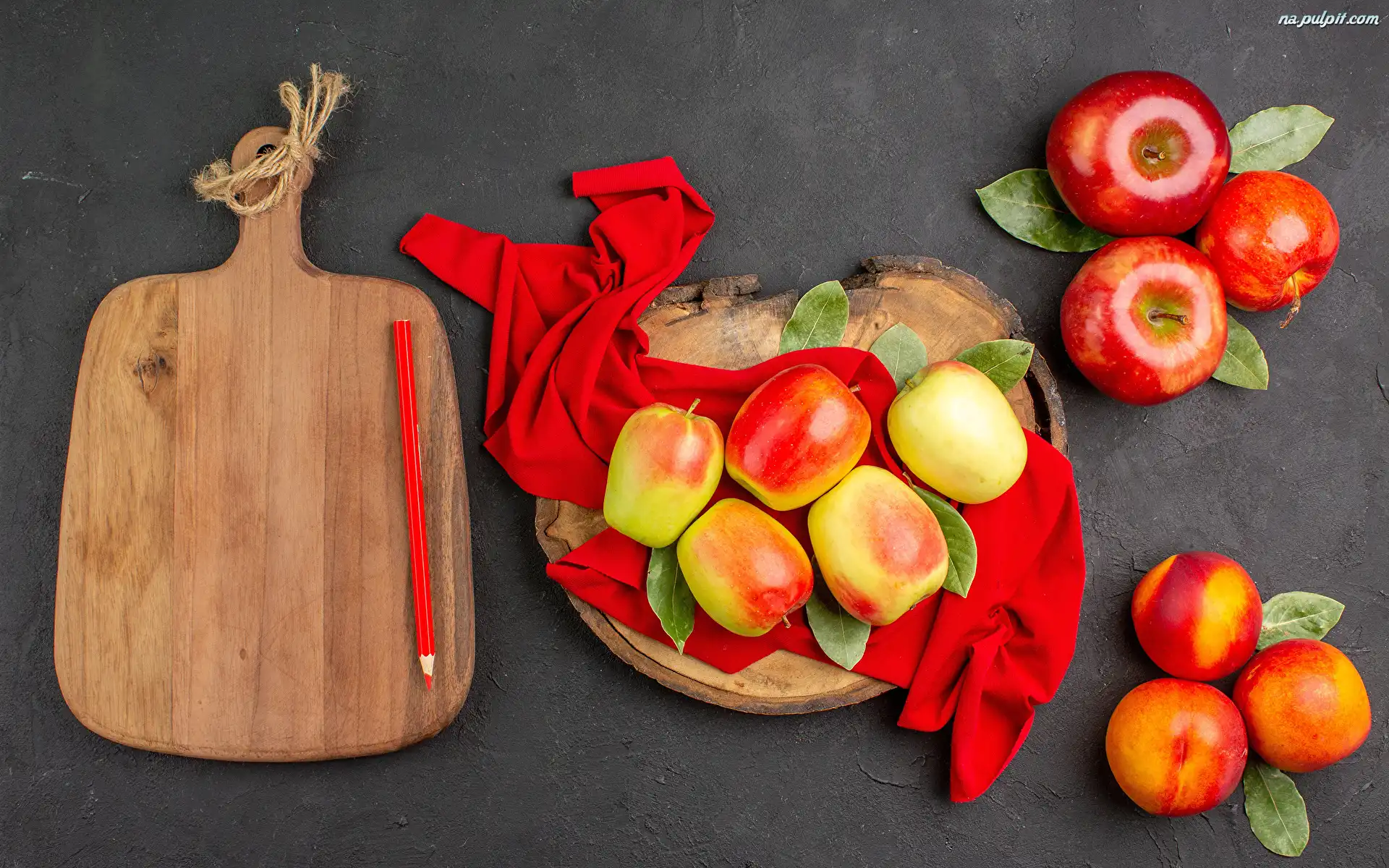 Jabłka, Dwie, Kredka, Owoce, Deski, Nektarynki
