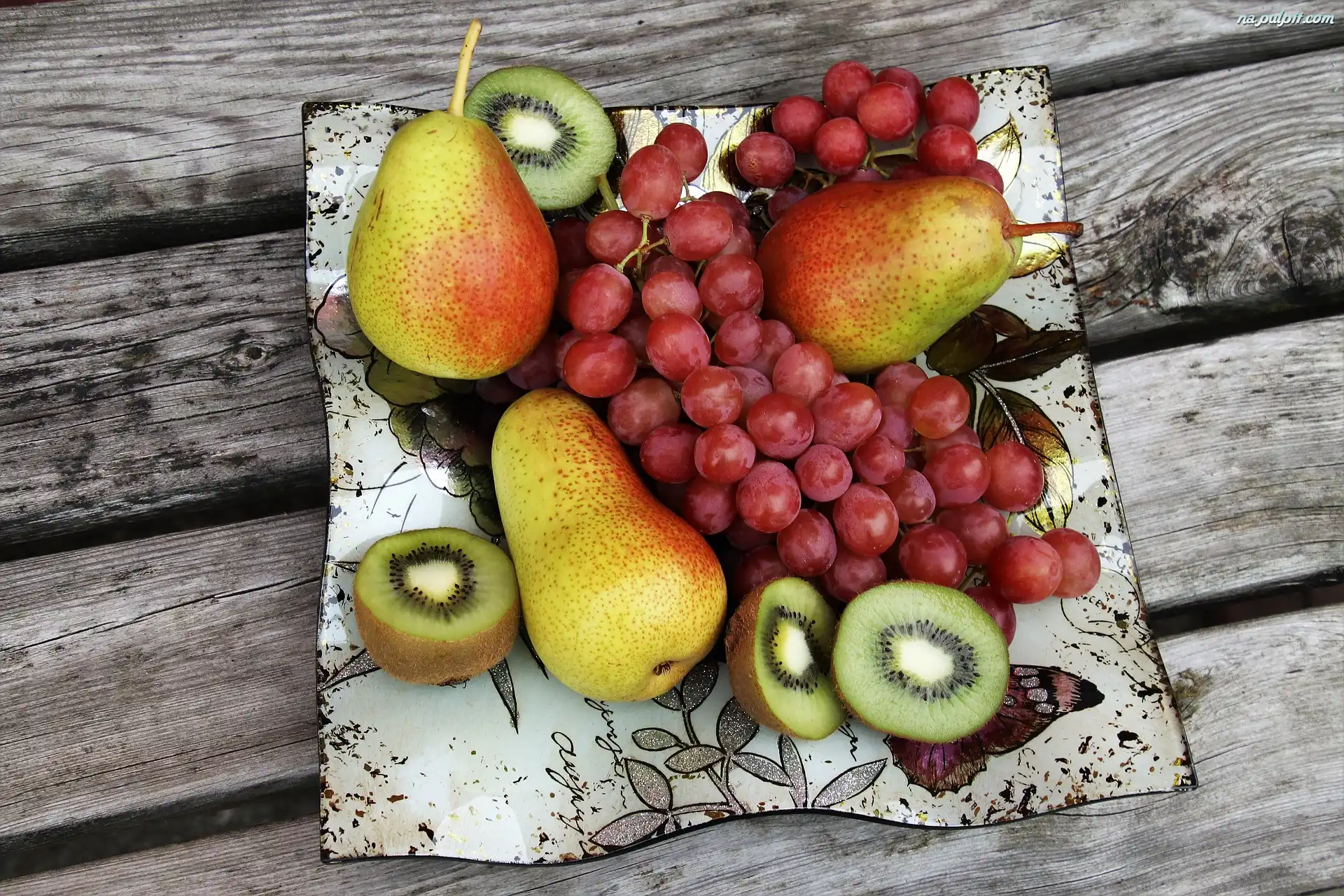 Owoce, Winogrona, Deski, Gruszki, Talerz, Kiwi