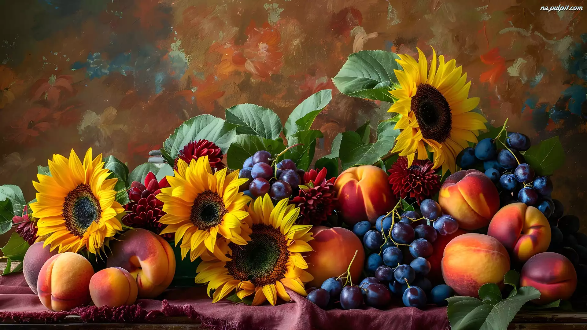 Brzoskwinie, Dalie, Winogrona, Kwiaty, Grafika, Stół, Słoneczniki, Owoce Na Pulpit
