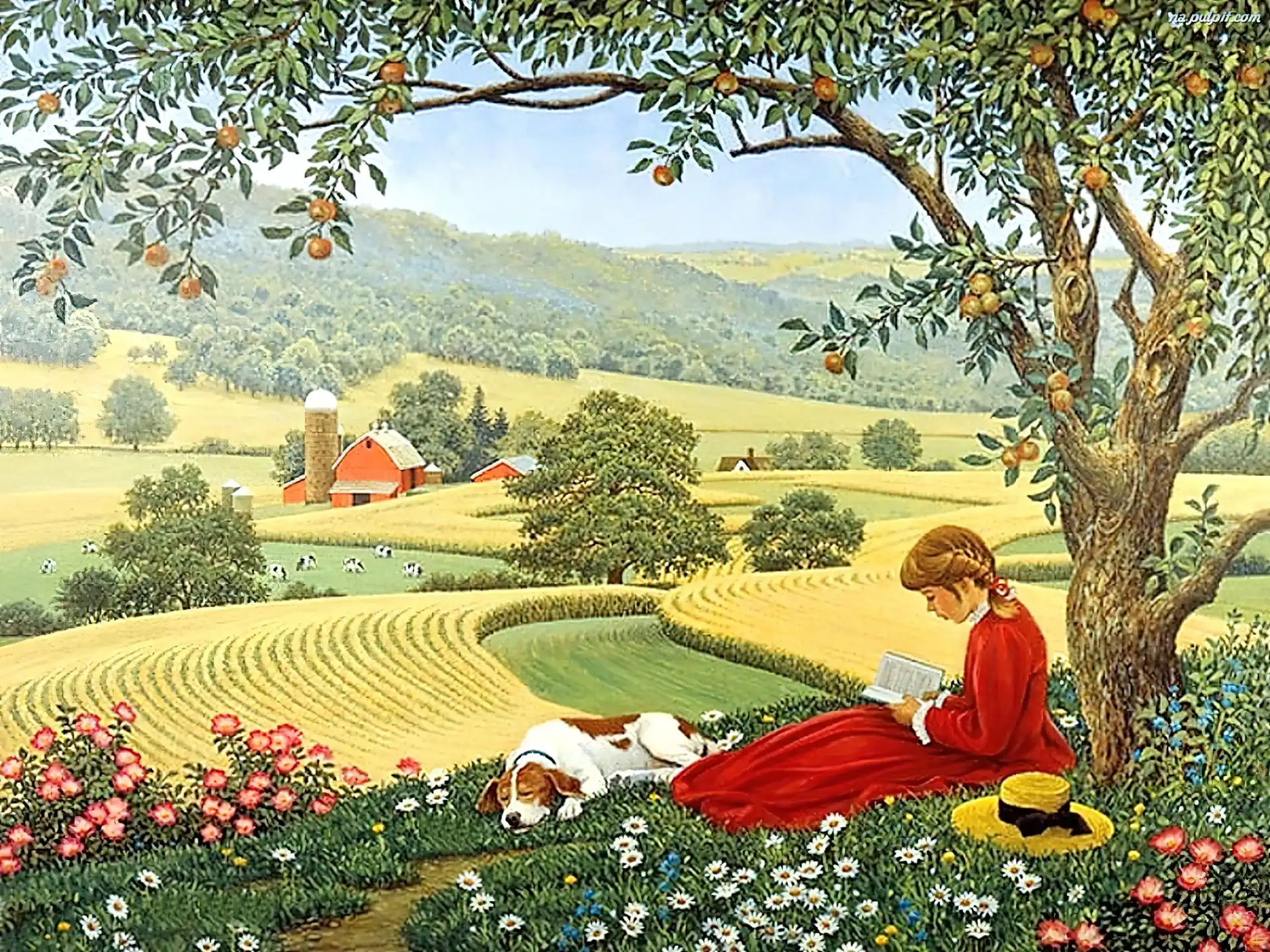Owocowe, Łąka, Pies, Dziewczyna, Drzewo