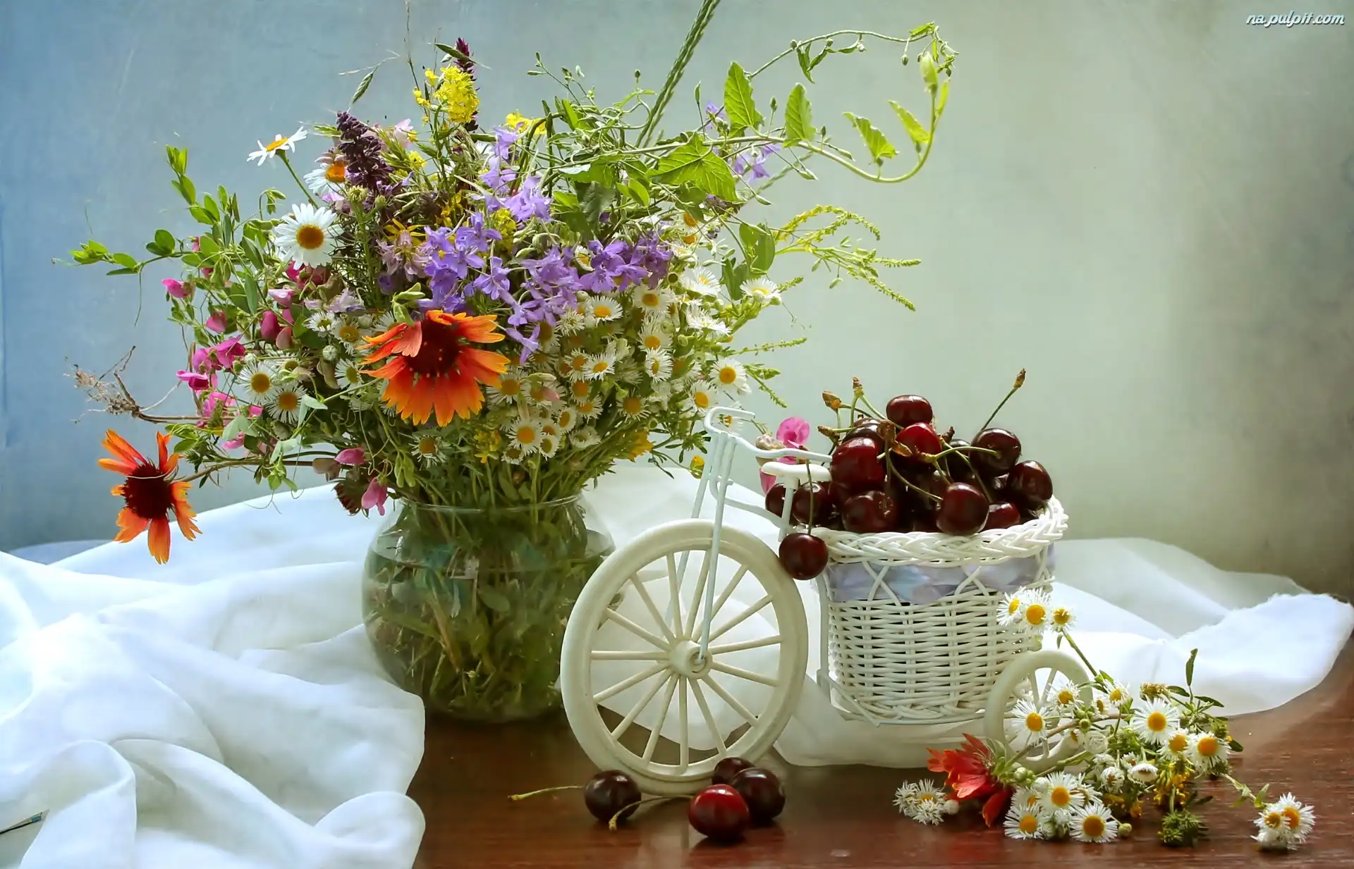 Kompozycja, Ozdobny Rowerek, Wazon, Bukiet Kwiatów, Czereśnie