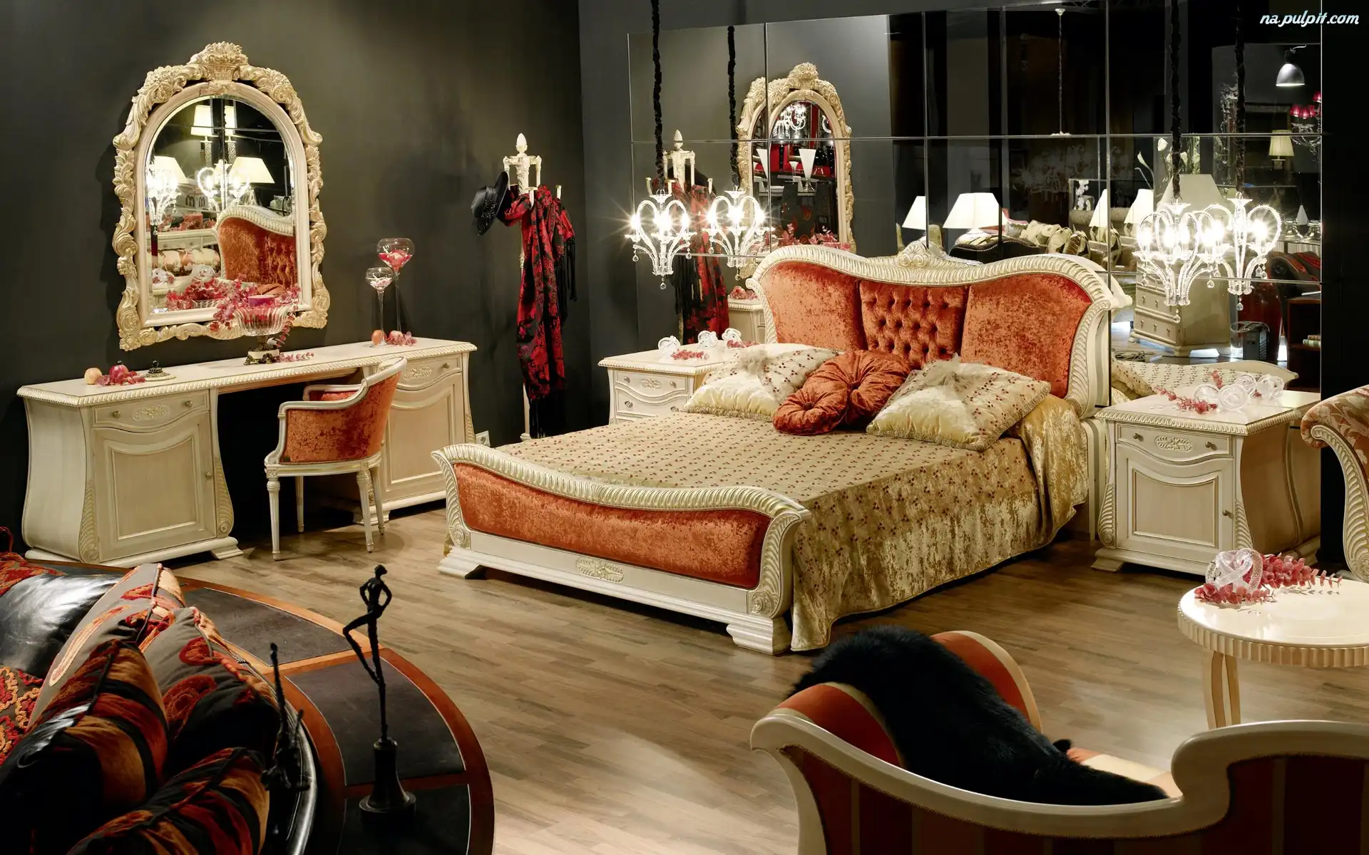 Łoże, Lampiony, Poduszki, Komoda, Sypialnia, Lustro Na Pulpit