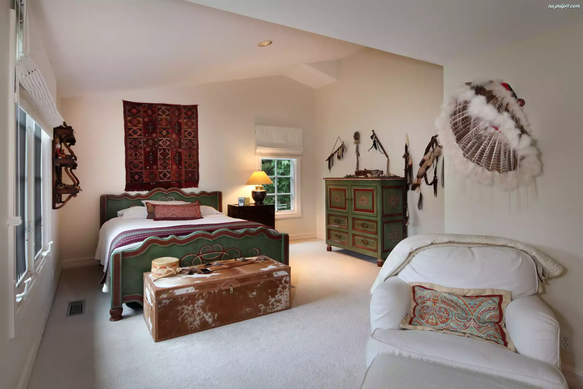 Pióropusz, Łóżko, Komoda, Makata, Poduszki, Skrzynia, Sypialnia, Fotel