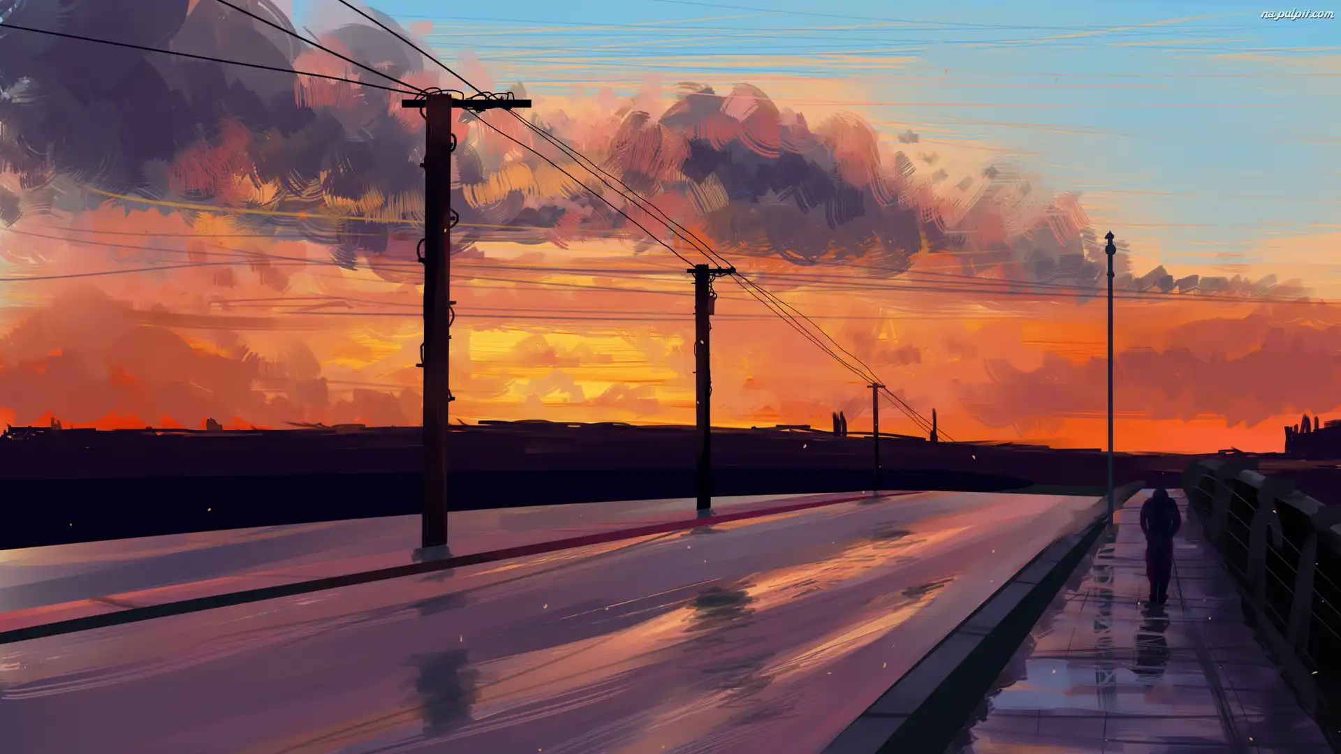 Paintography, Słupy elektryczne, Człowiek, Droga, Chmury Na Pulpit