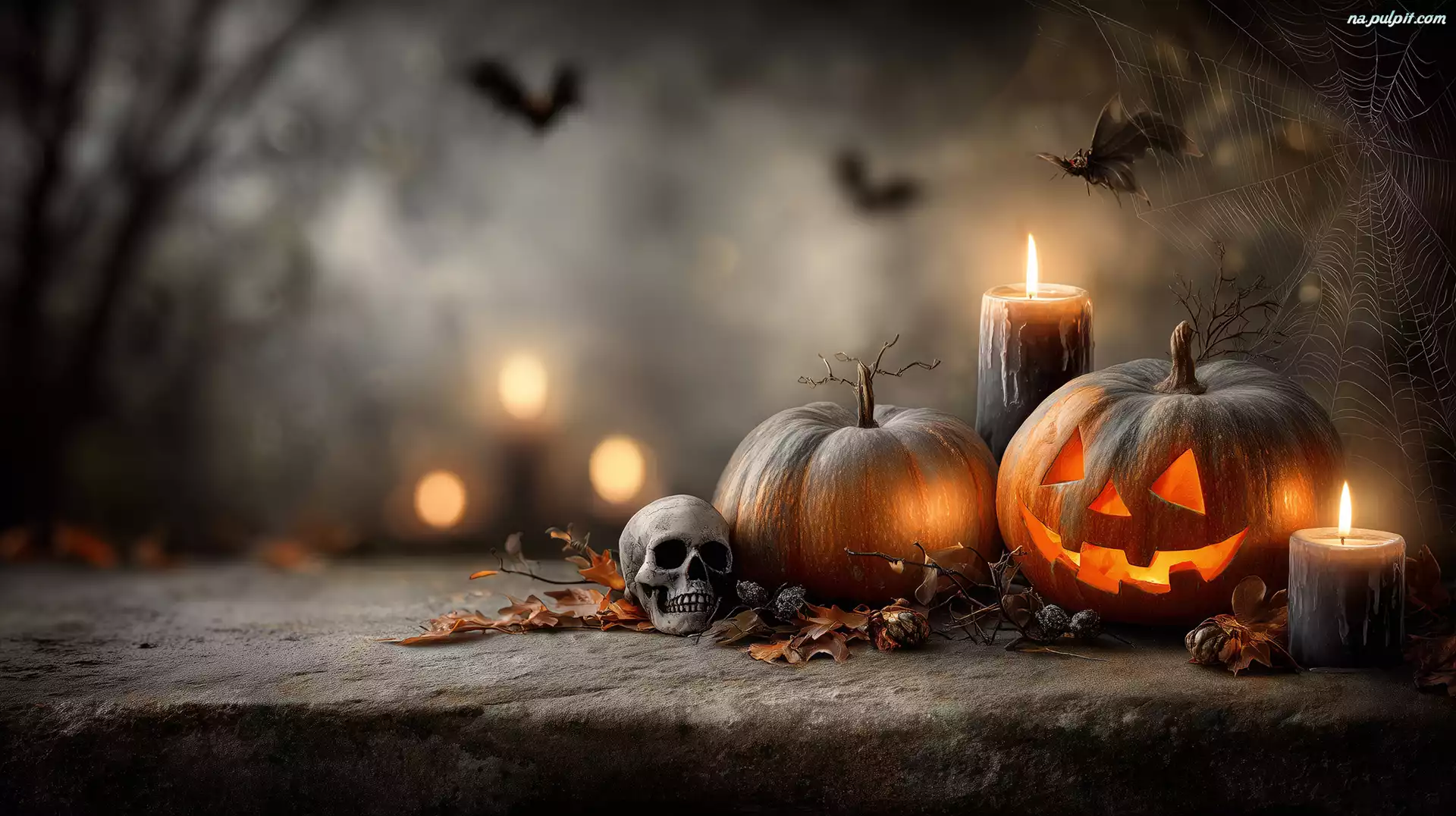 Halloween, Czaszka, Świece, Pajęczyna, Dynie, Grafika AI