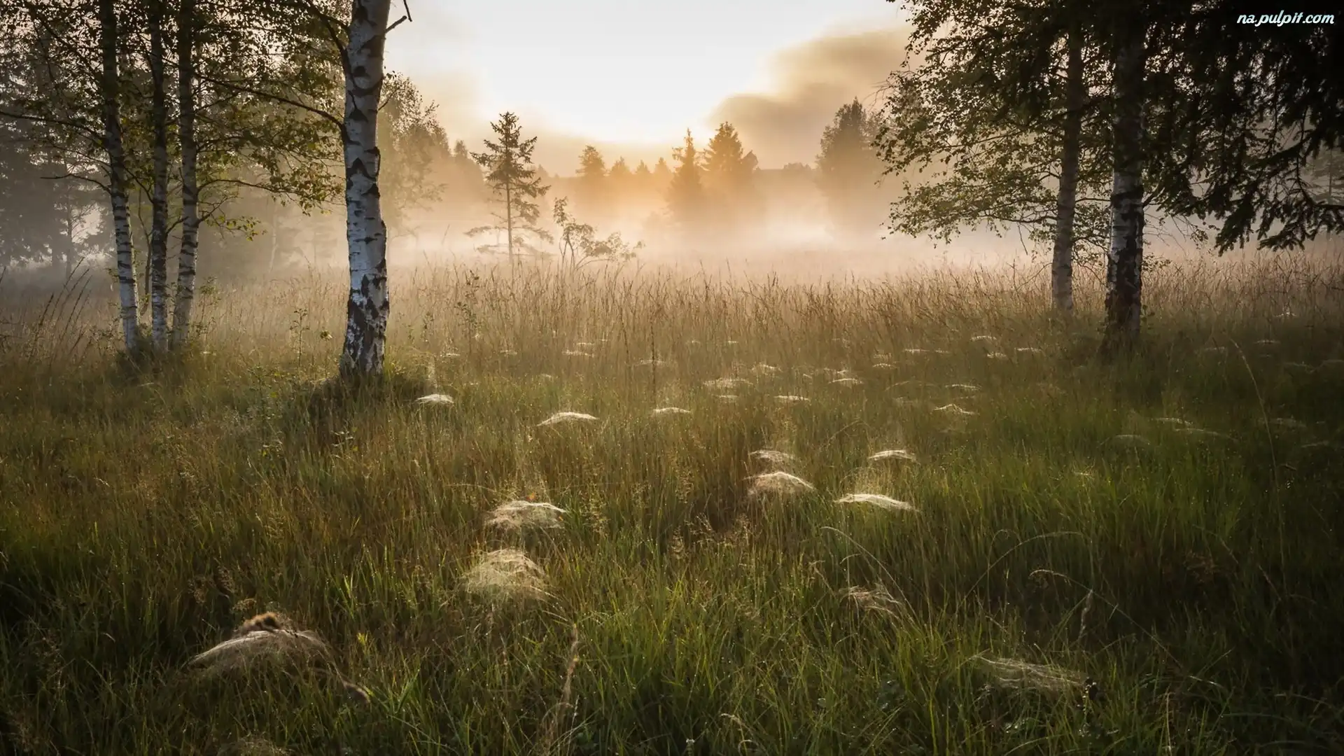 Pajęczyny, Mgła, Las, Brzozowy, Polana