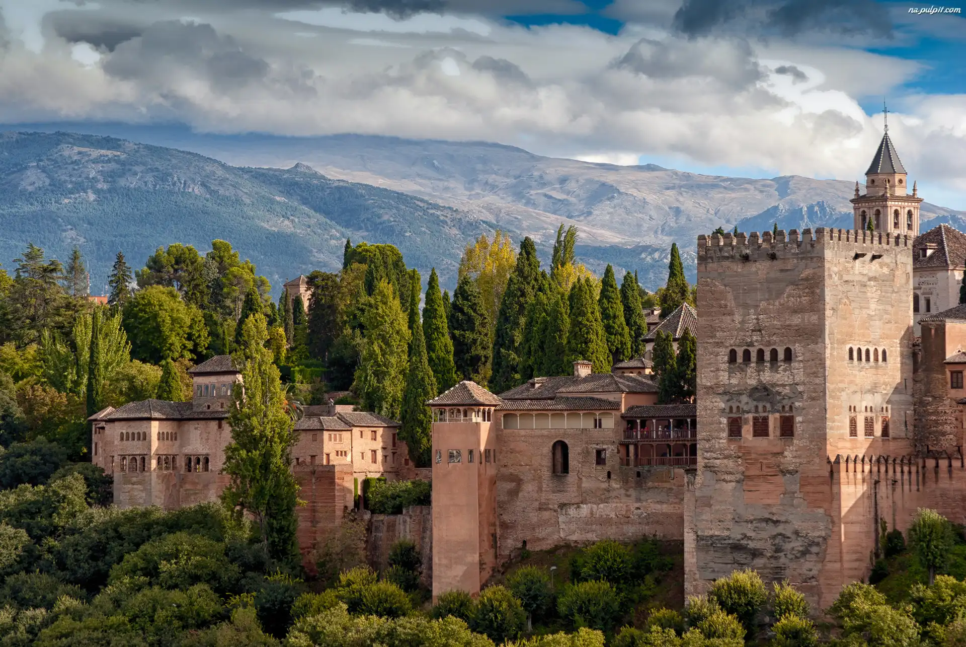 Granada, Góry, Drzewa, Pałac Alhambra, Niebo, Hiszpania Na Pulpit