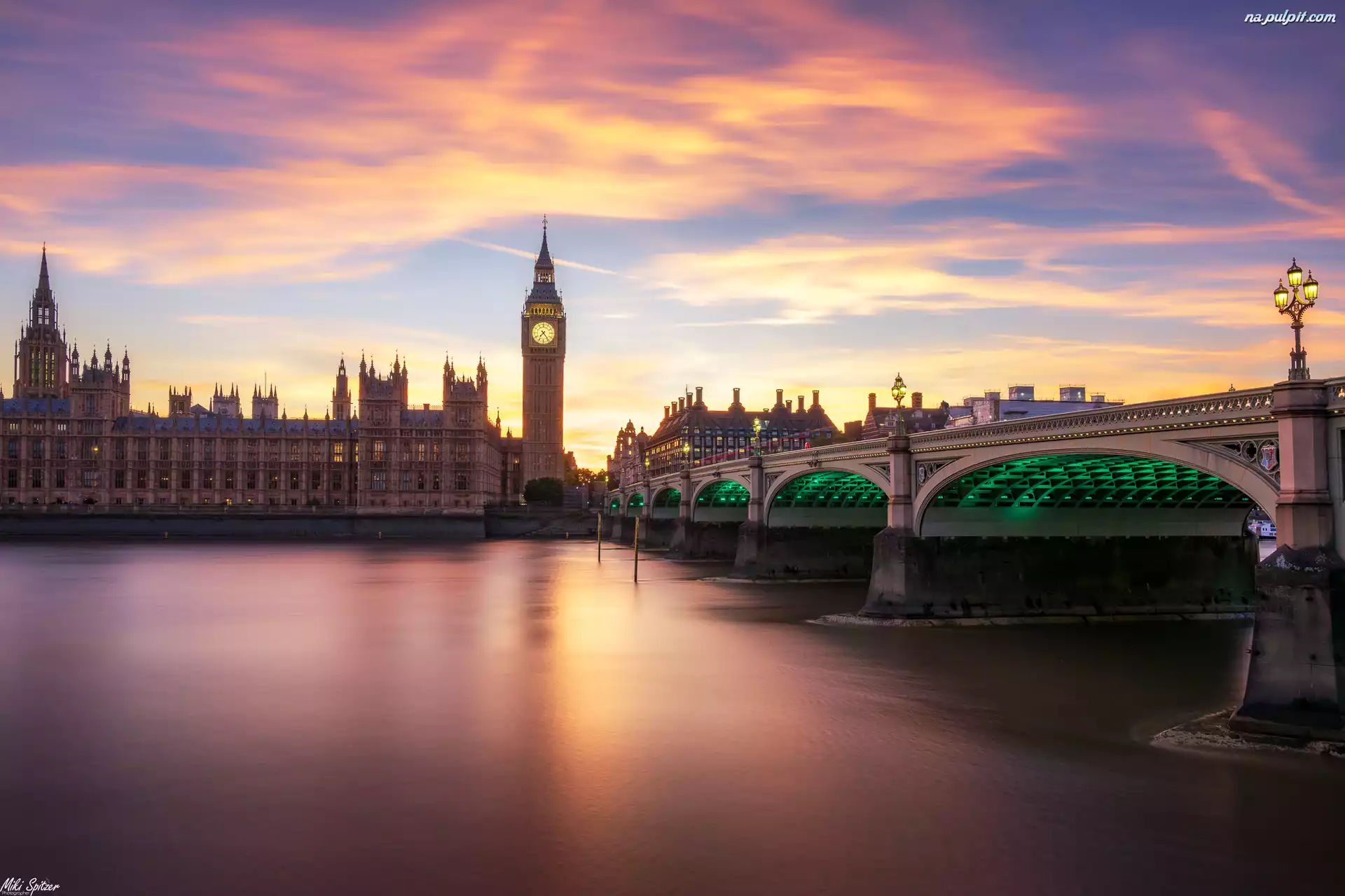 Anglia, Tamiza, Wielka Brytania, Rzeka, Wieża Zegarowa, Pałac Westminsterski, Zachód słońca, Most, Big Ben, Londyn Na Pulpit |