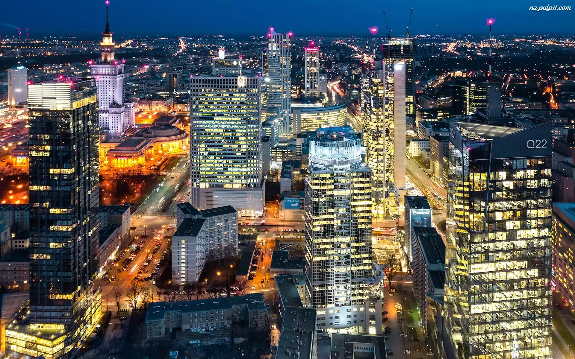 Pałac kultury, Noc, Z lotu ptaka, Polska, Warszawa, Wieżowce, Oświetlenie Na Pulpit