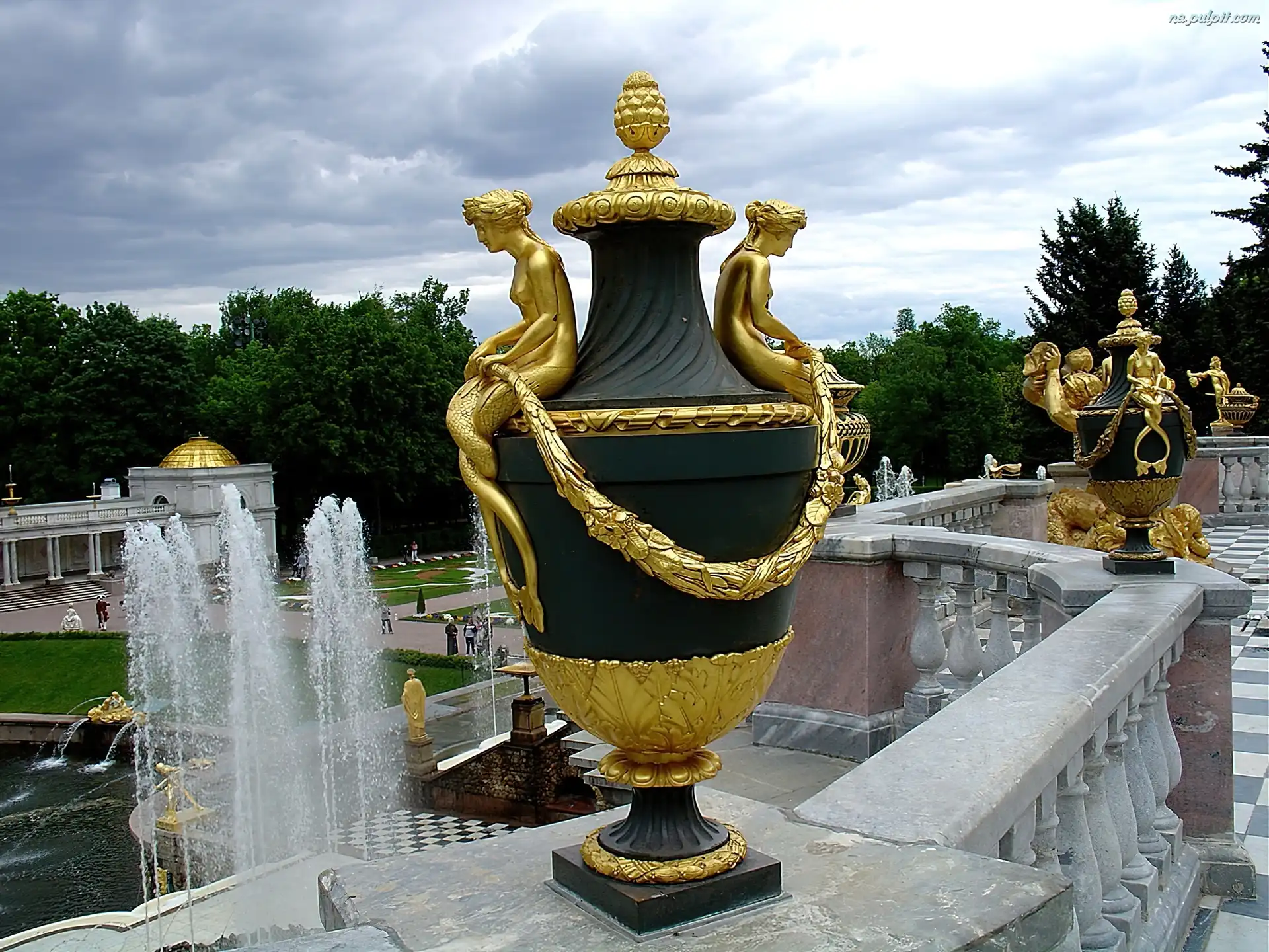 Rosja, Pałacowy, St. Petersburg, Złote, Taras, Fontanna, Rzezby Na Pulpit