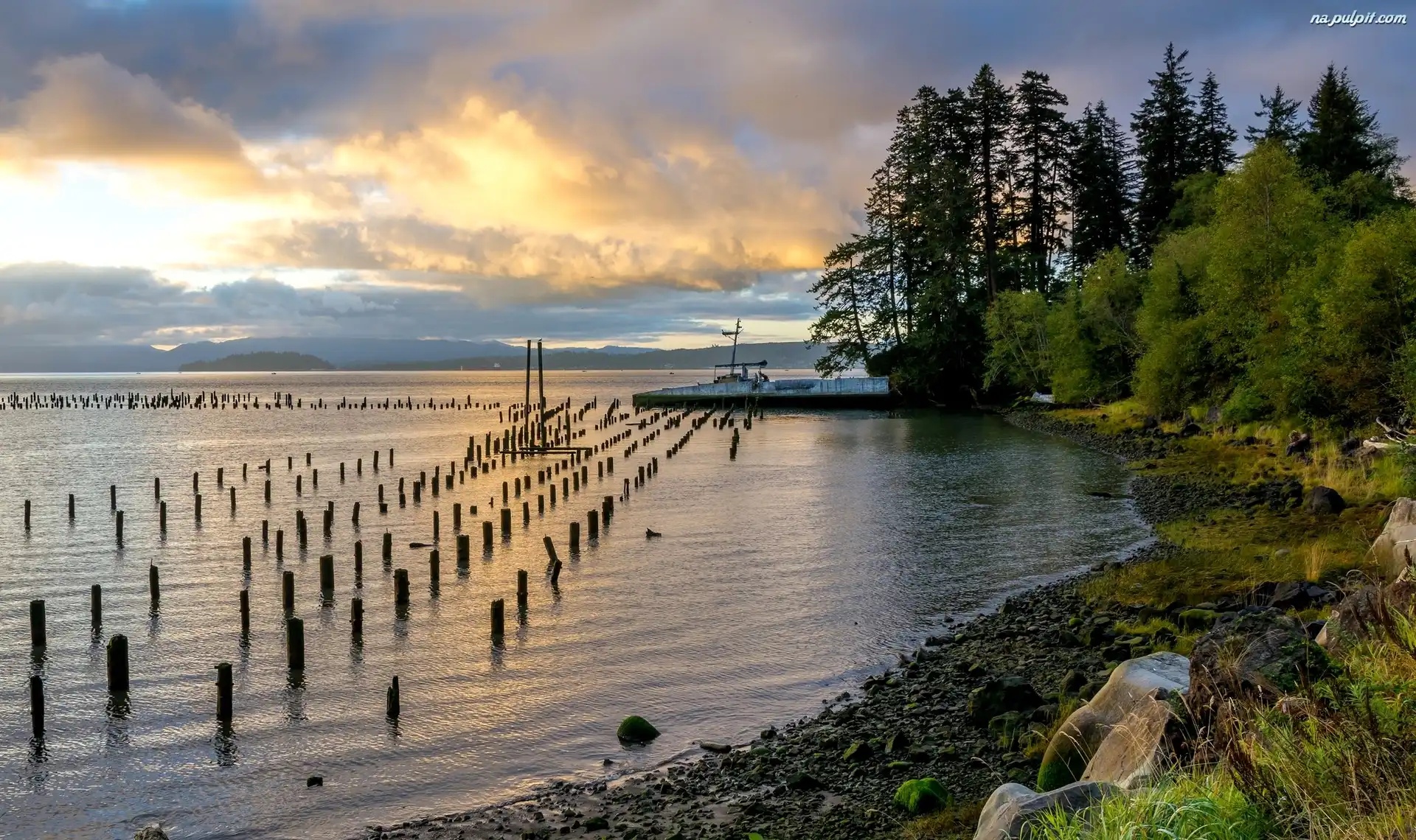 Słońca, Pale, Wschód, Kamienie, Brzeg, Jezioro, Drzewa