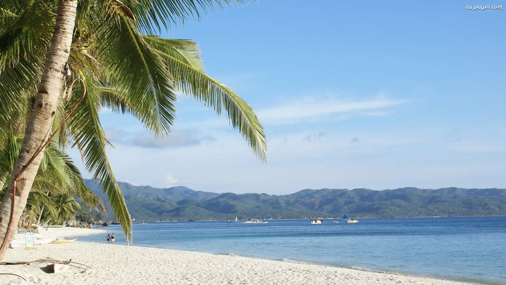 Palma, Wzgórza, Niebo, Woda, Piasek, Łodzie