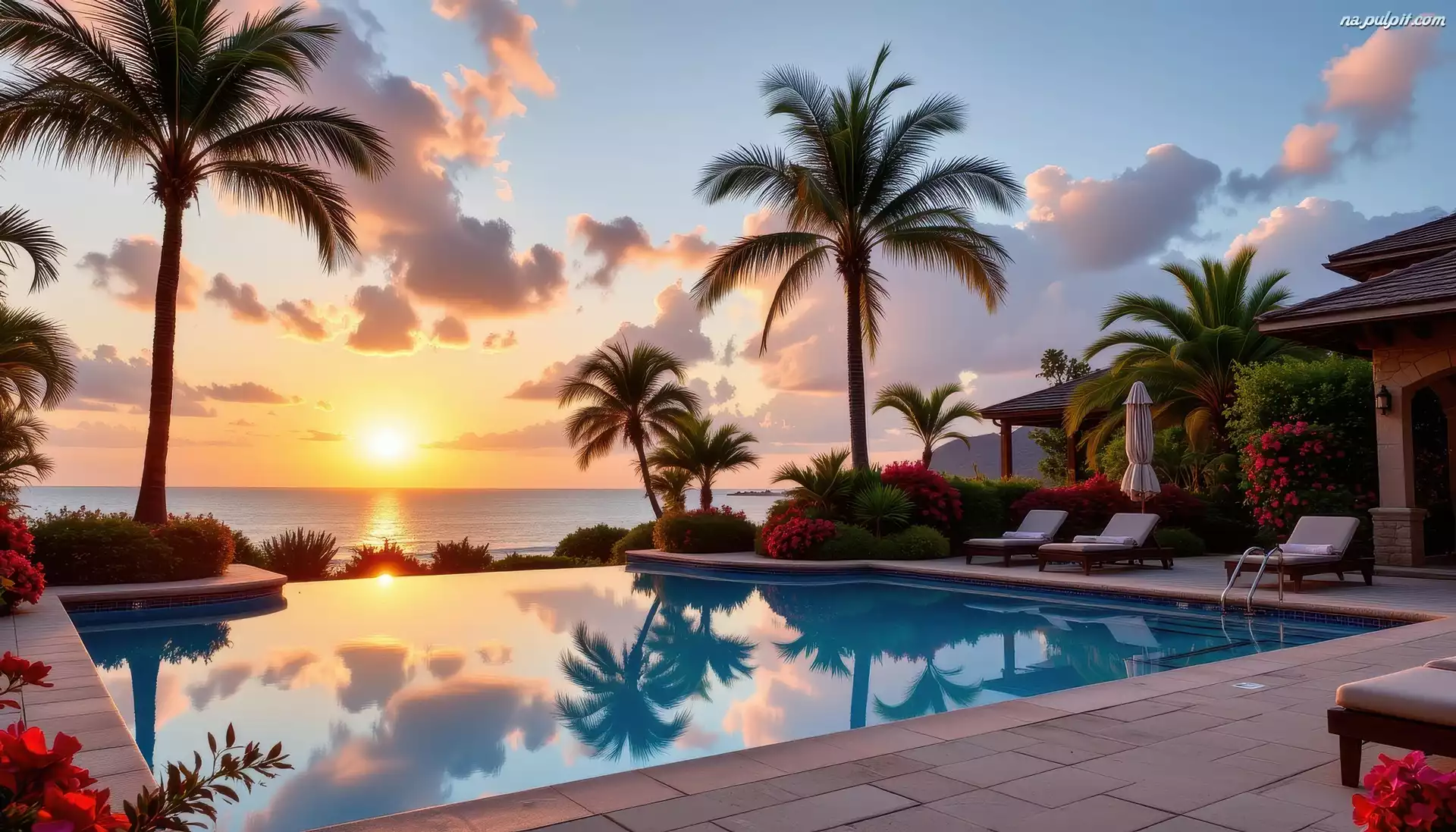 Zachód słońca, Basen, Palmy, Grafika AI, Morze Na Pulpit