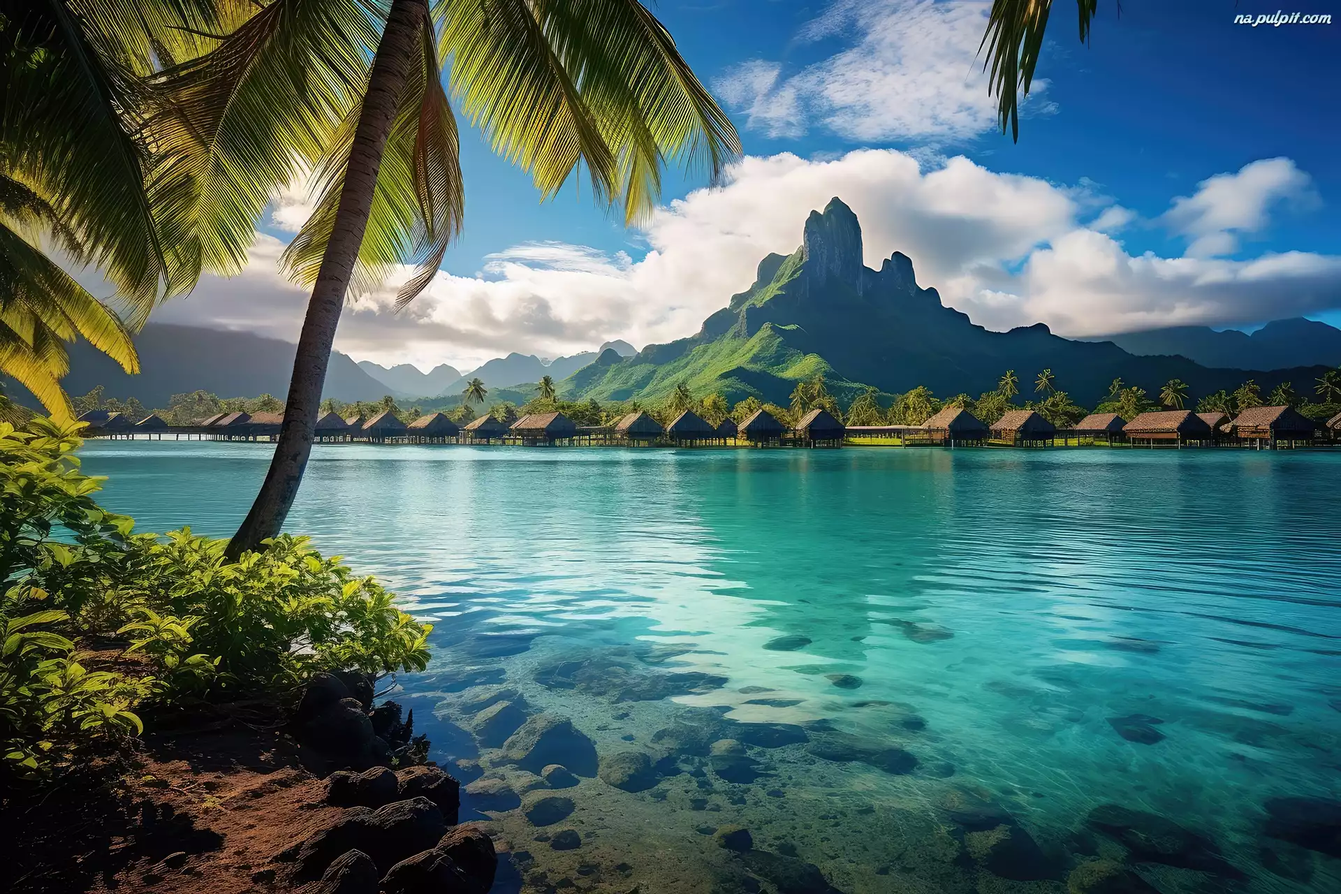 Grafika, Góra, Bungalow, Palmy, Morze, Domy, Tropiki Na Pulpit