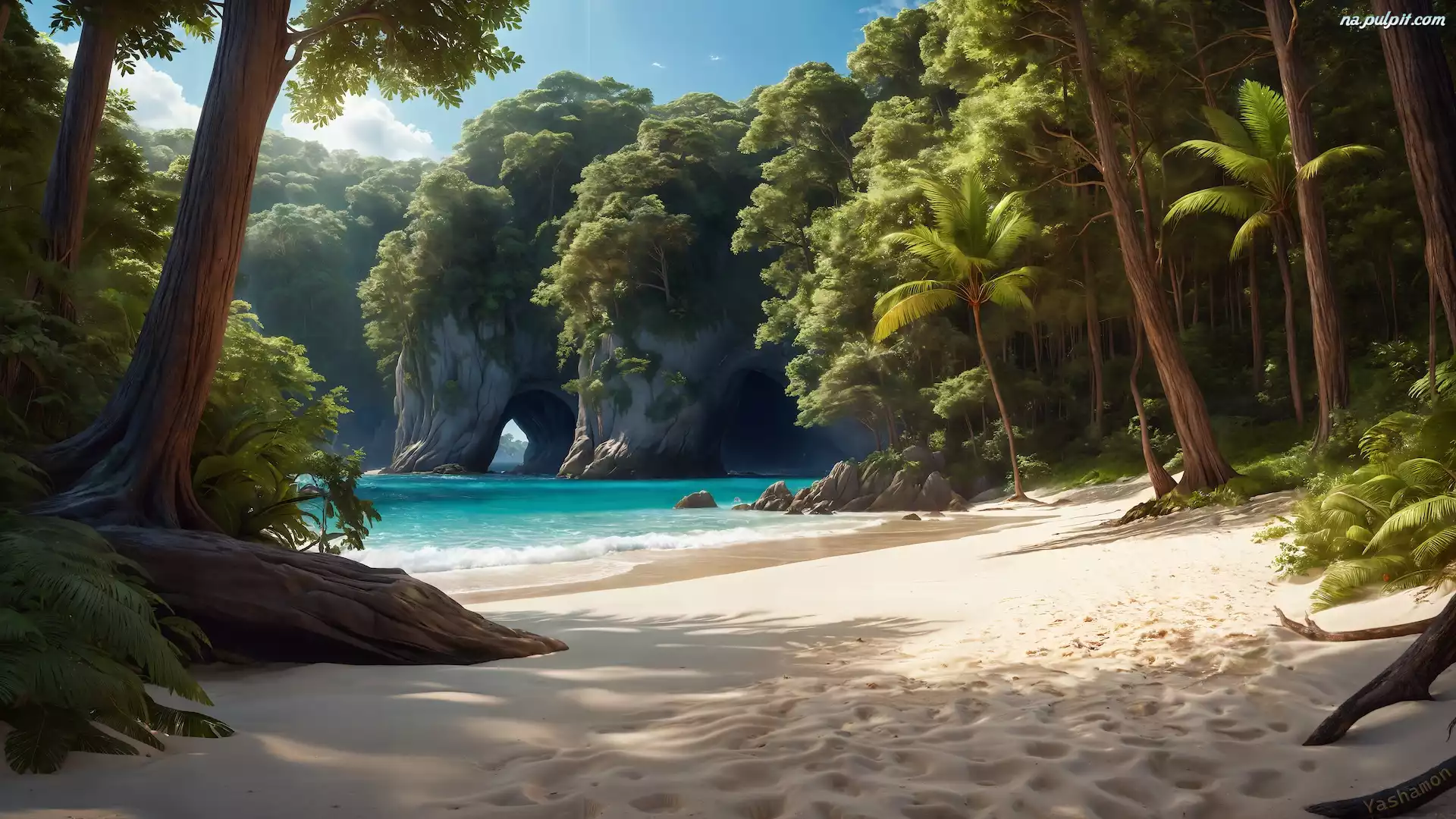 Skały, Morze, Drzewa, Palmy, Plaża, Grafika Na Pulpit