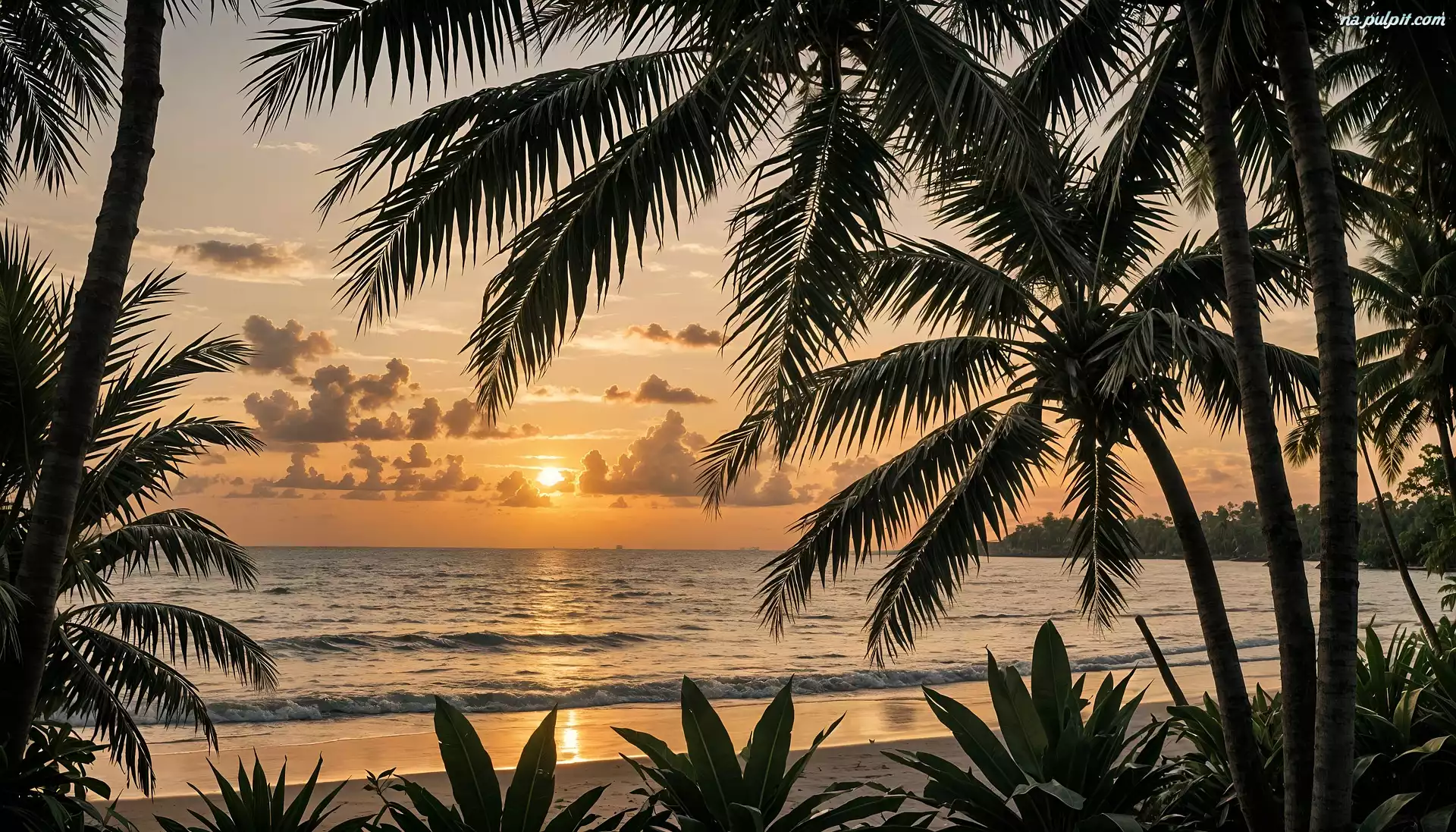 Tropiki, Palmy, Morze, Zachód słońca Na Pulpit