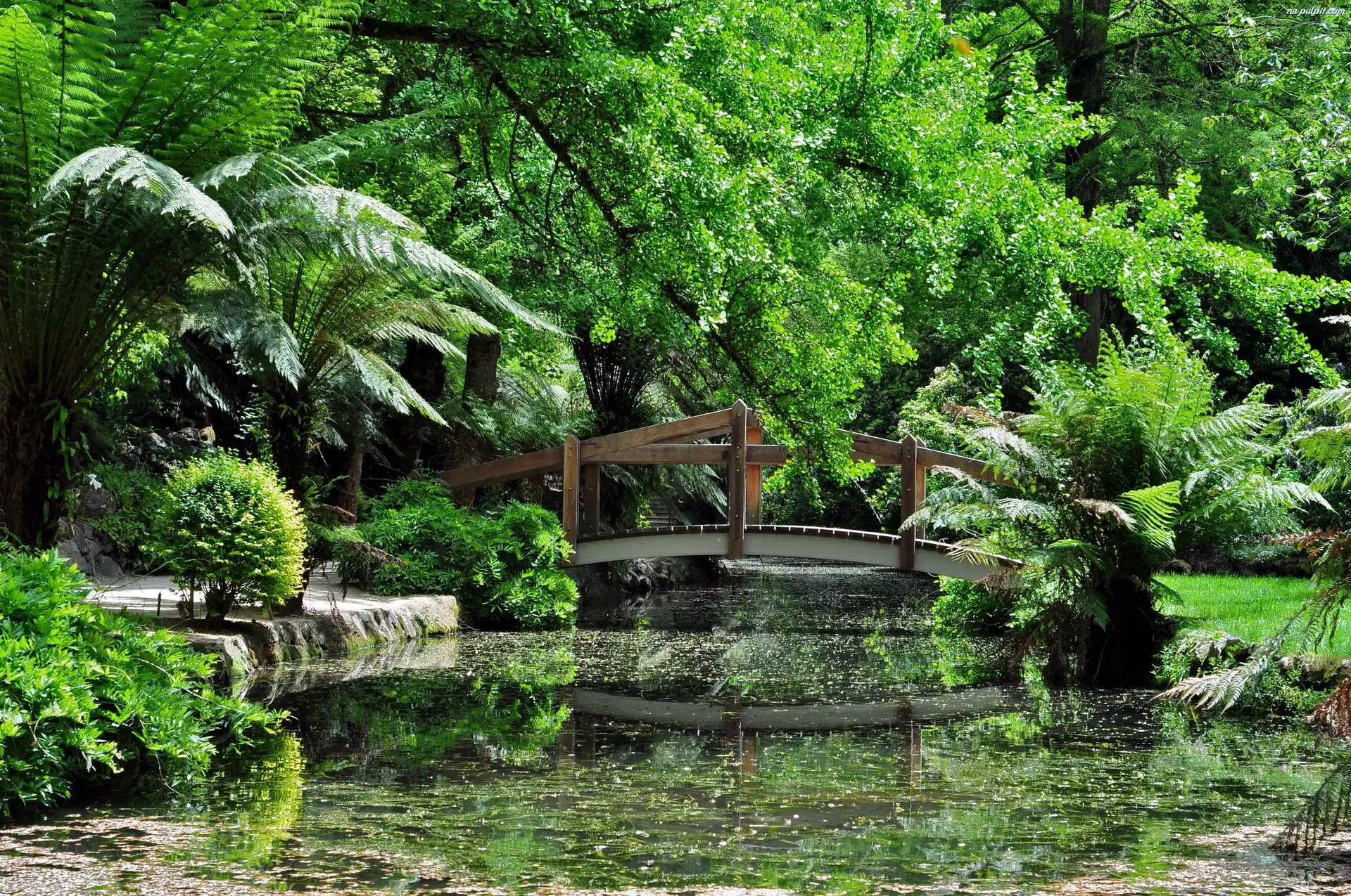 Palmy, Staw, Egzotyczny, Park, Mostek