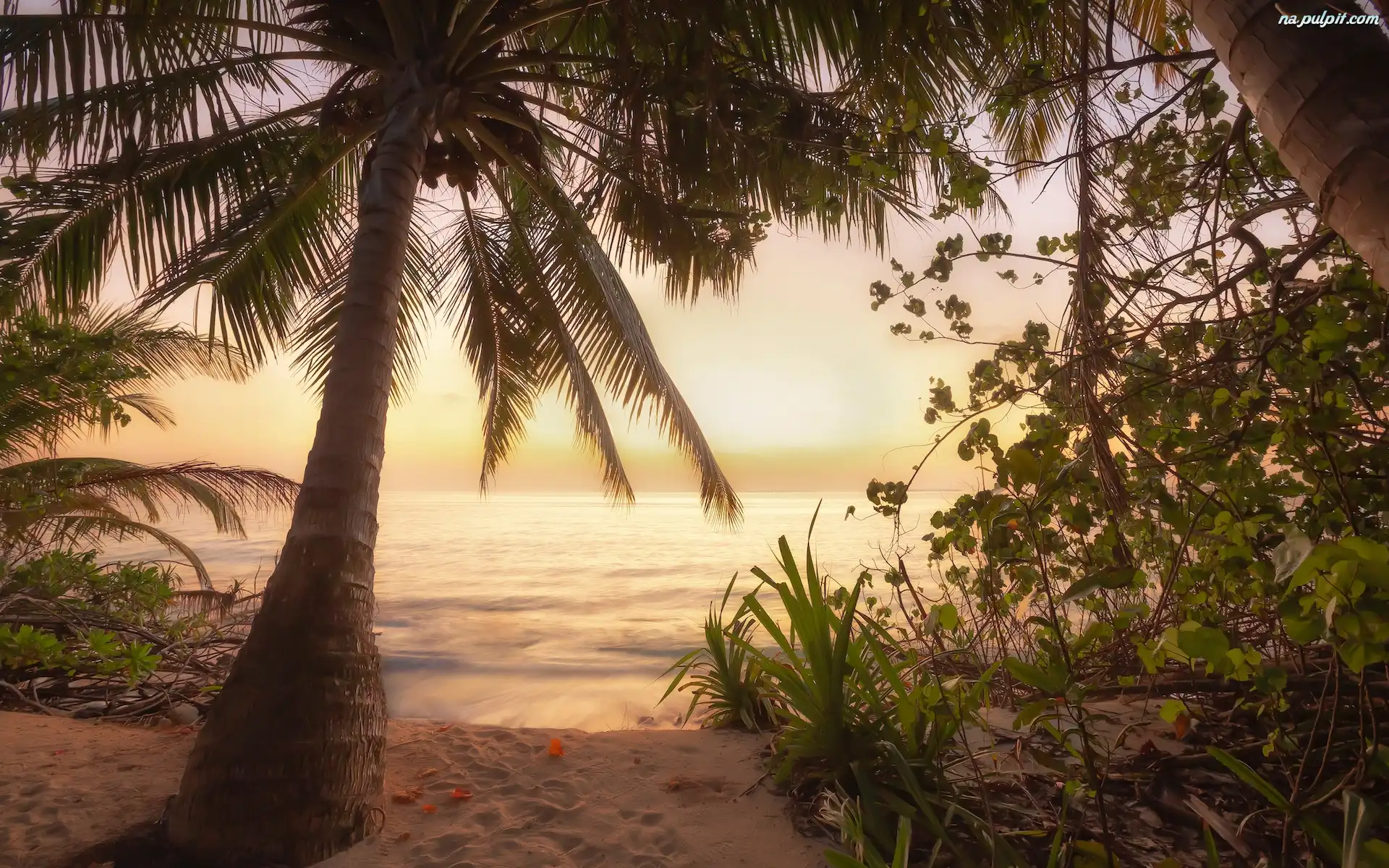 Palmy, Morze, Malediwy, Wschód słońca, Plaża Na Pulpit