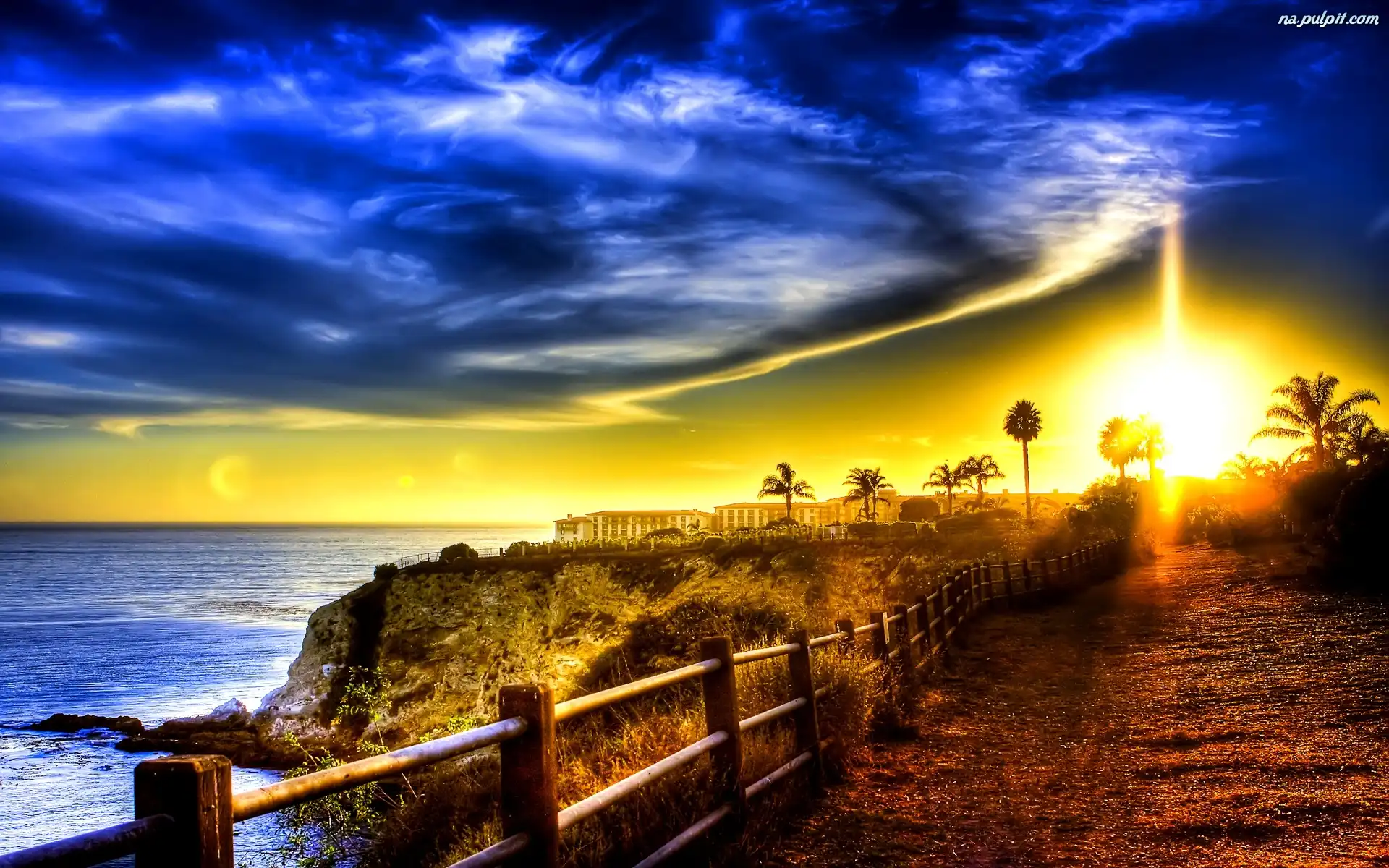 Palmy, Morze, Słońca, Zachód, Droga Na Pulpit