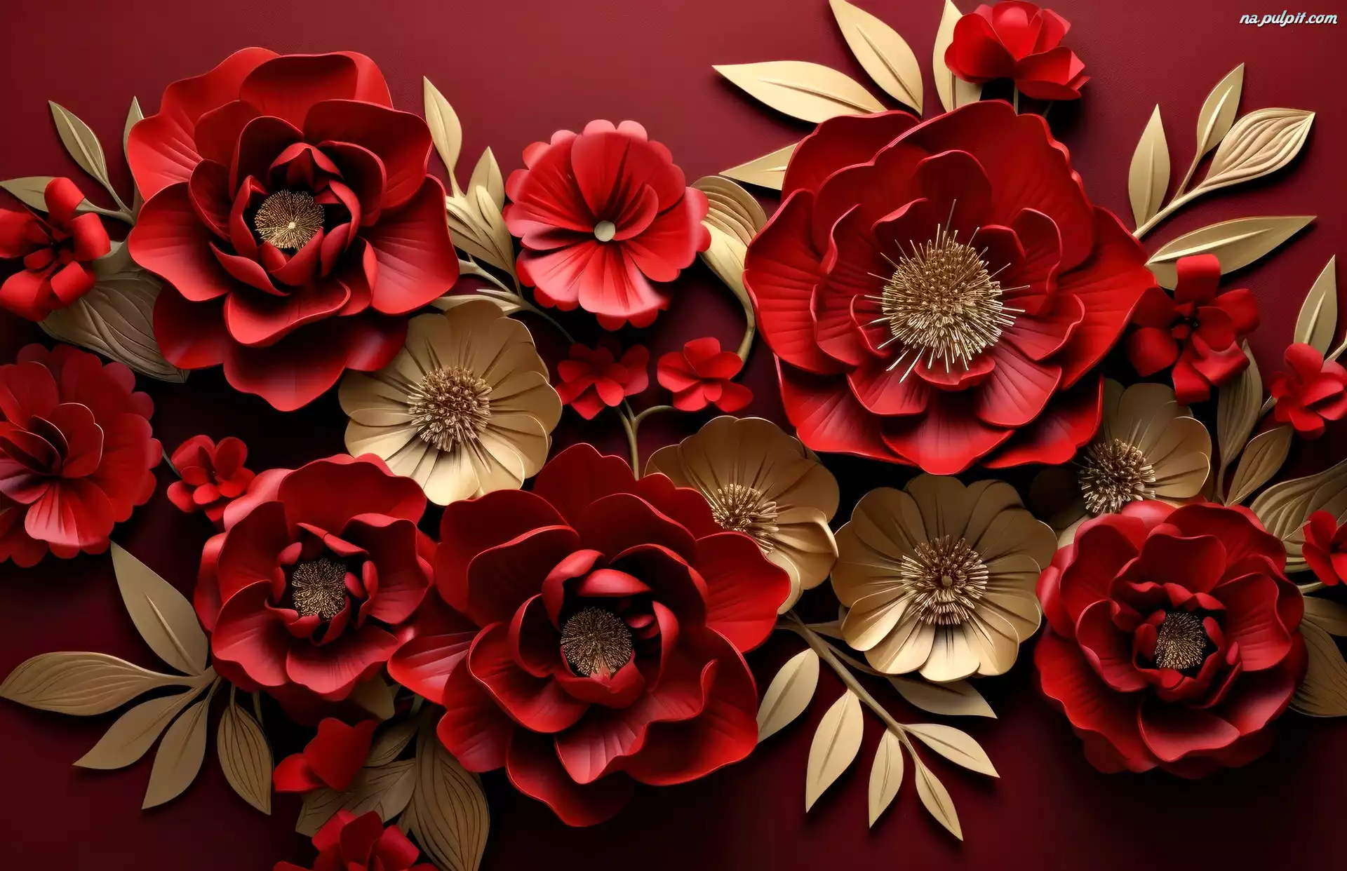 Kwiaty, Papierowe, Czerwone, Grafika, Złote Na Pulpit