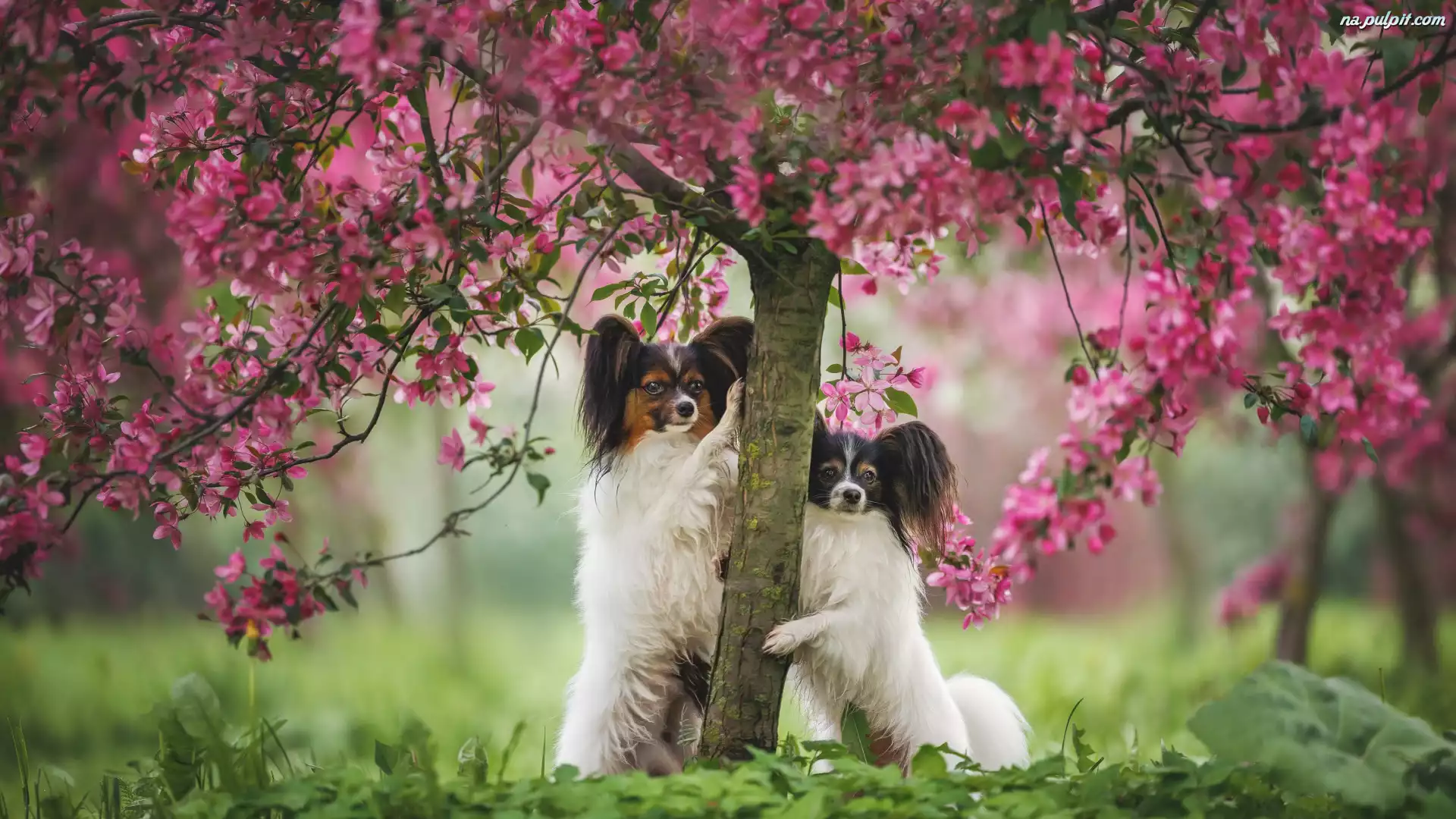 Kwitnące, Dwa, Psy, Drzewo, Spaniele kontynentalne miniaturowe Papillon Na Pulpit
