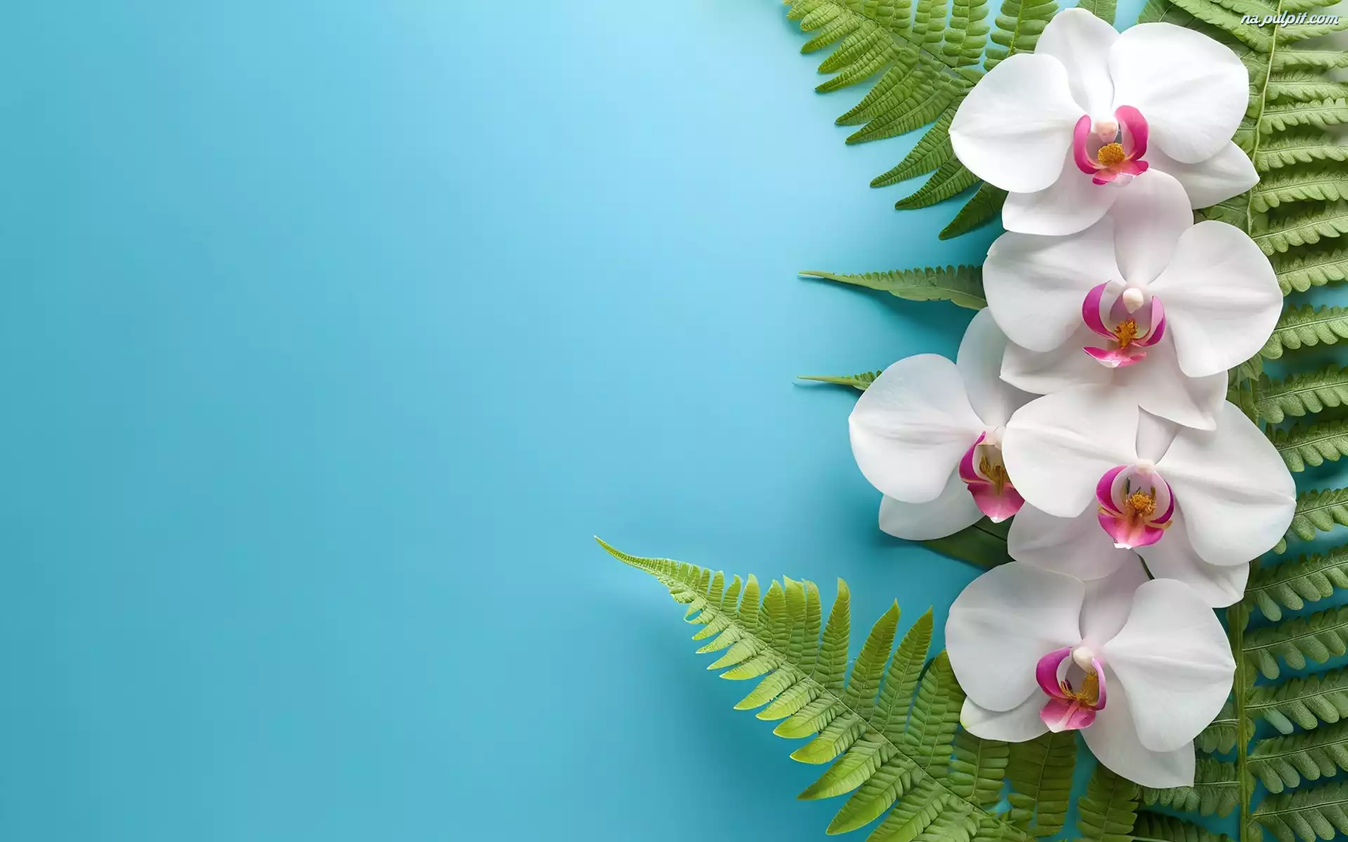 Niebieskie, Białe, Liście, Paproci, Storczyki, Tło Na Pulpit
