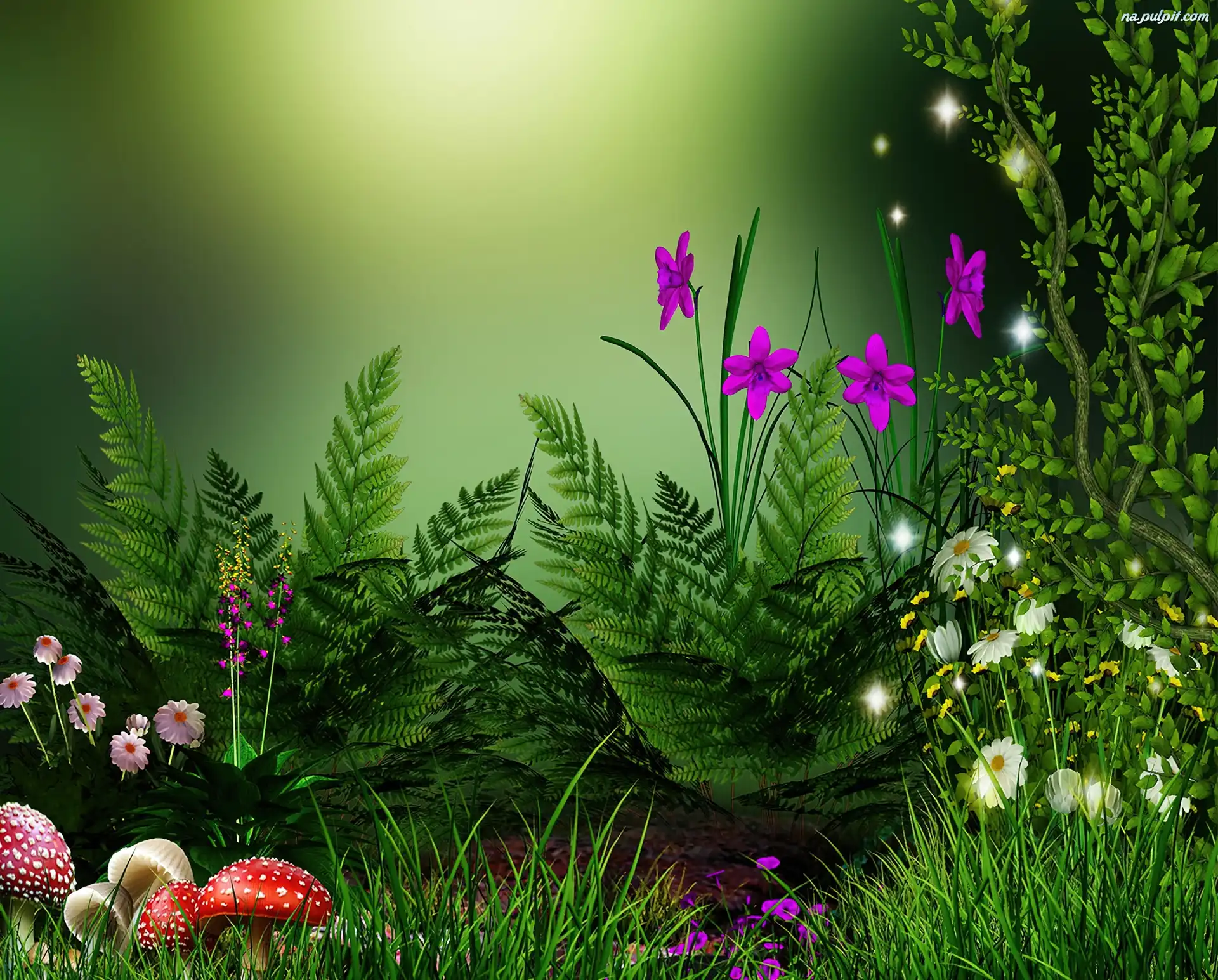 Paprocie, Kwiaty, Grafika, Muchomorki Na Pulpit