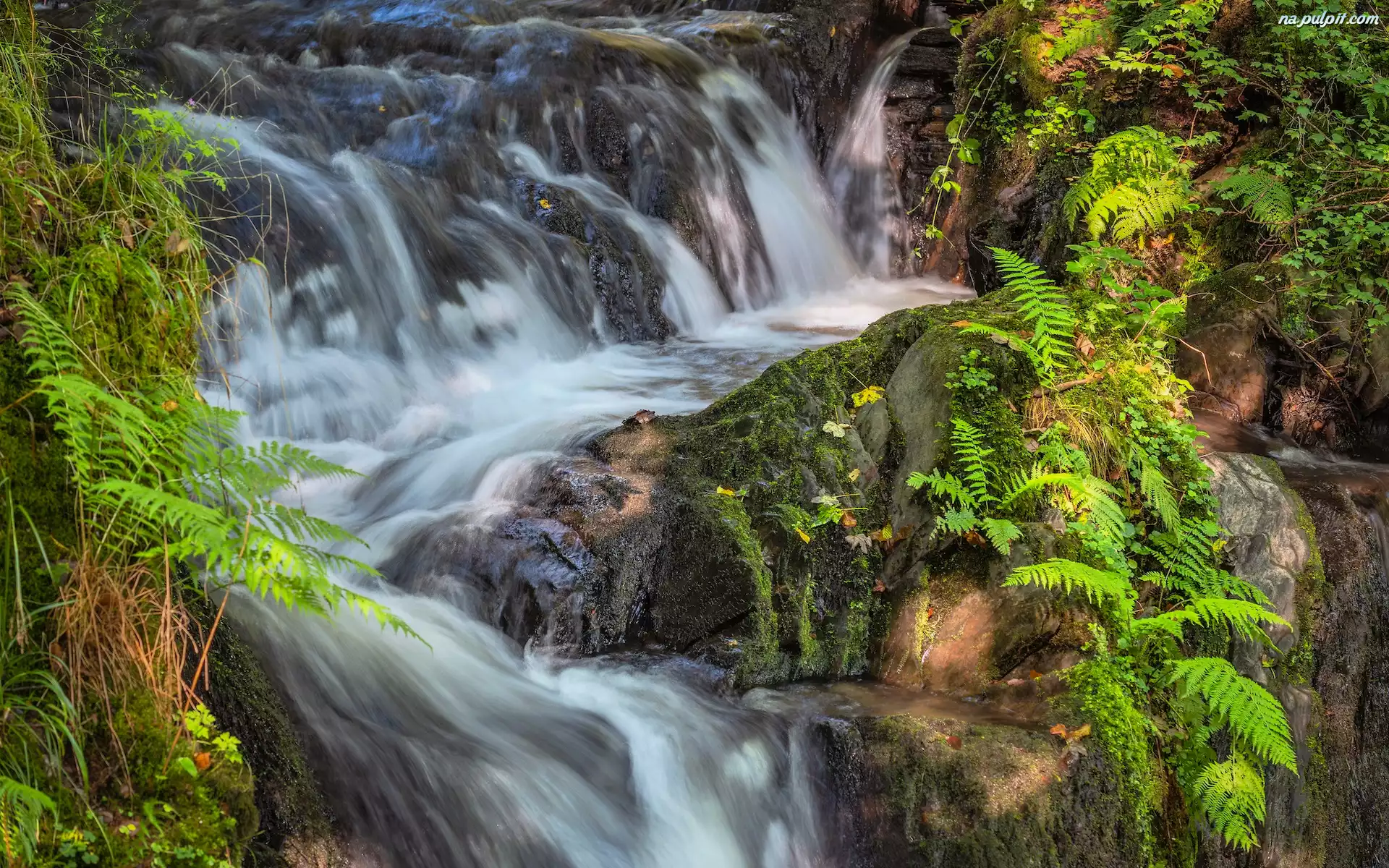 Paprocie, Endert Wasserfall, Wodospad, Niemcy, Nadrenia Palatynat, Skały, Roślinność Na Pulpit