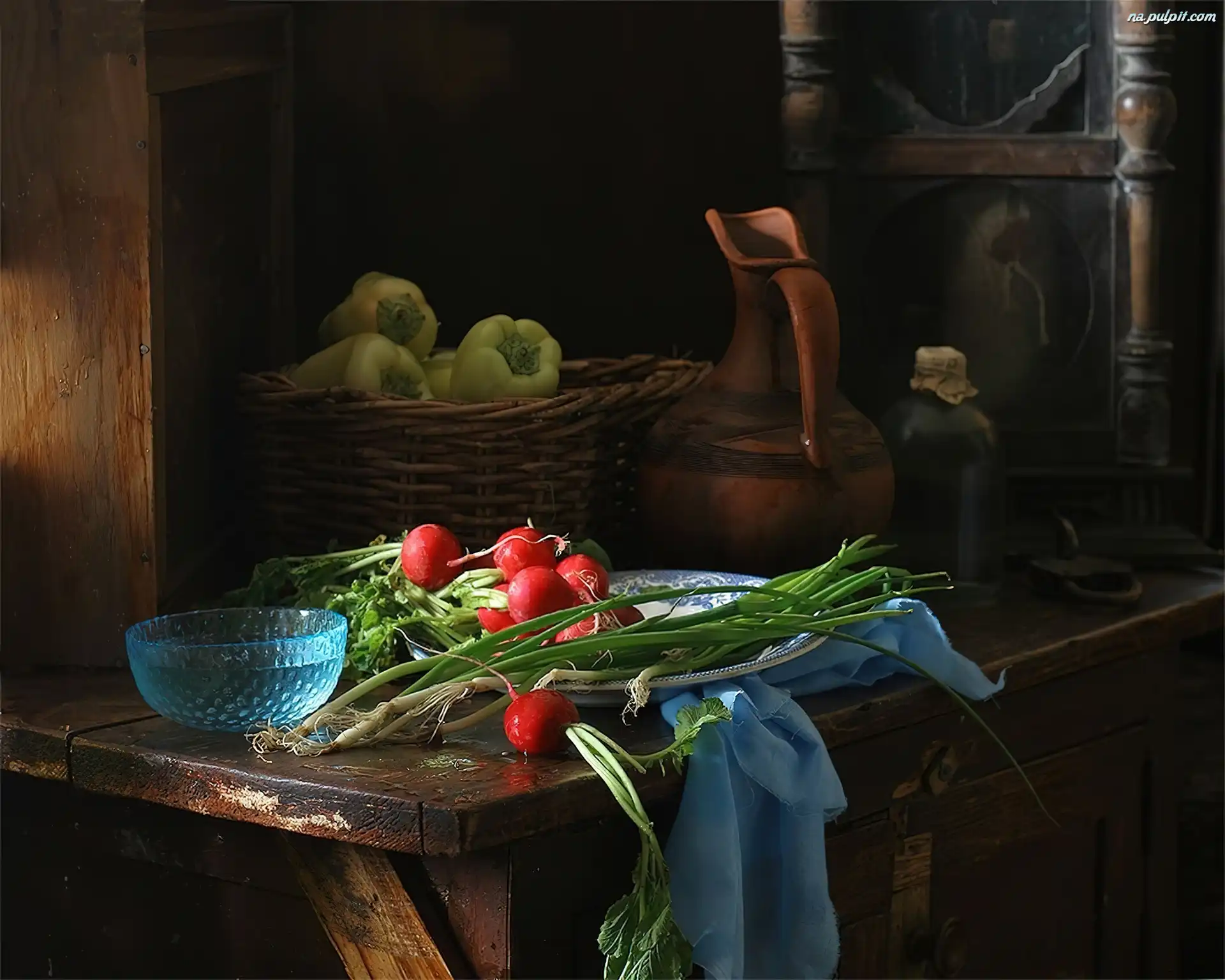 Papryka, Rzodkiewka, Naczynia, Stare, Szczypiorek