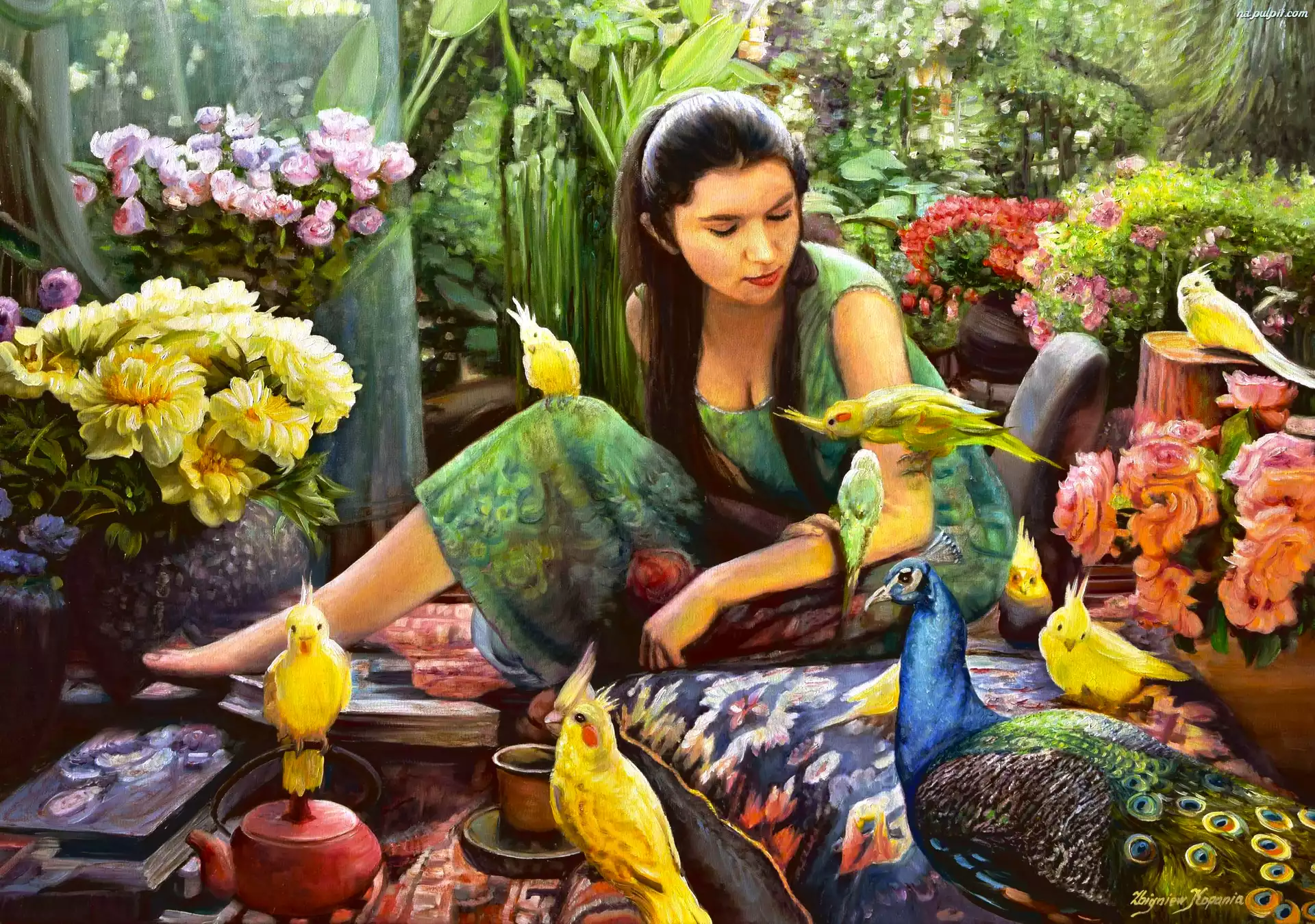Papugi, Obraz, Zbigniew Kopania, Malarstwo, Dziewczyna