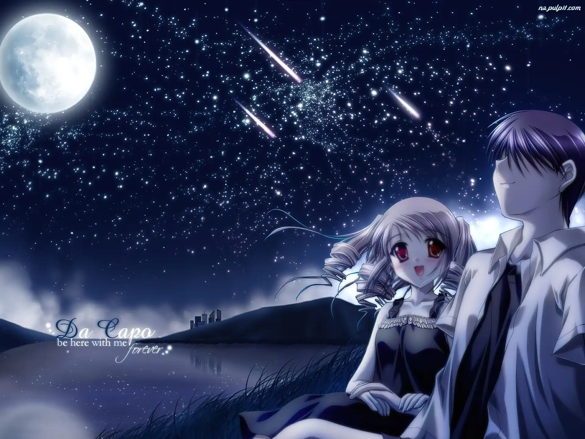 lÄ…d, para, jezioro, noc, ludzie, Da Capo, gwiazdy