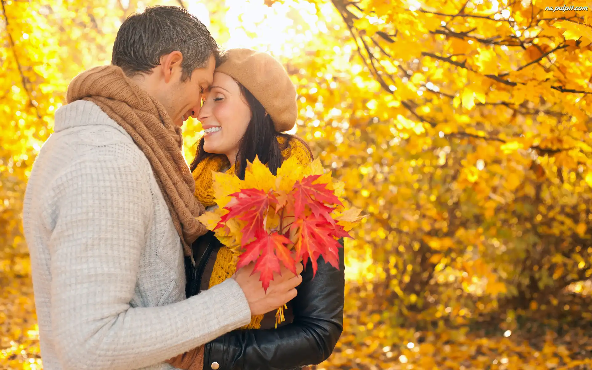 Liście, Para, Zakochani, Uśmiechy, Radość, Krajobraz, Ludzie, Jesień Na Pulpit