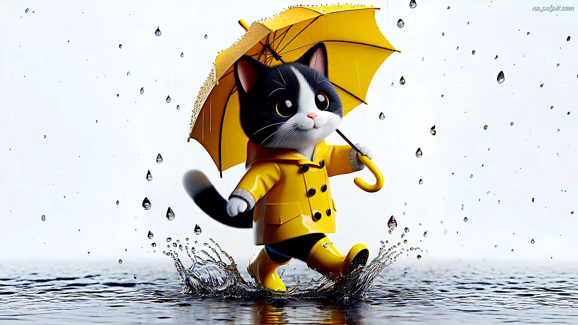 Kałuża, Kot, Kurtka, Parasol, Żółta, Grafika