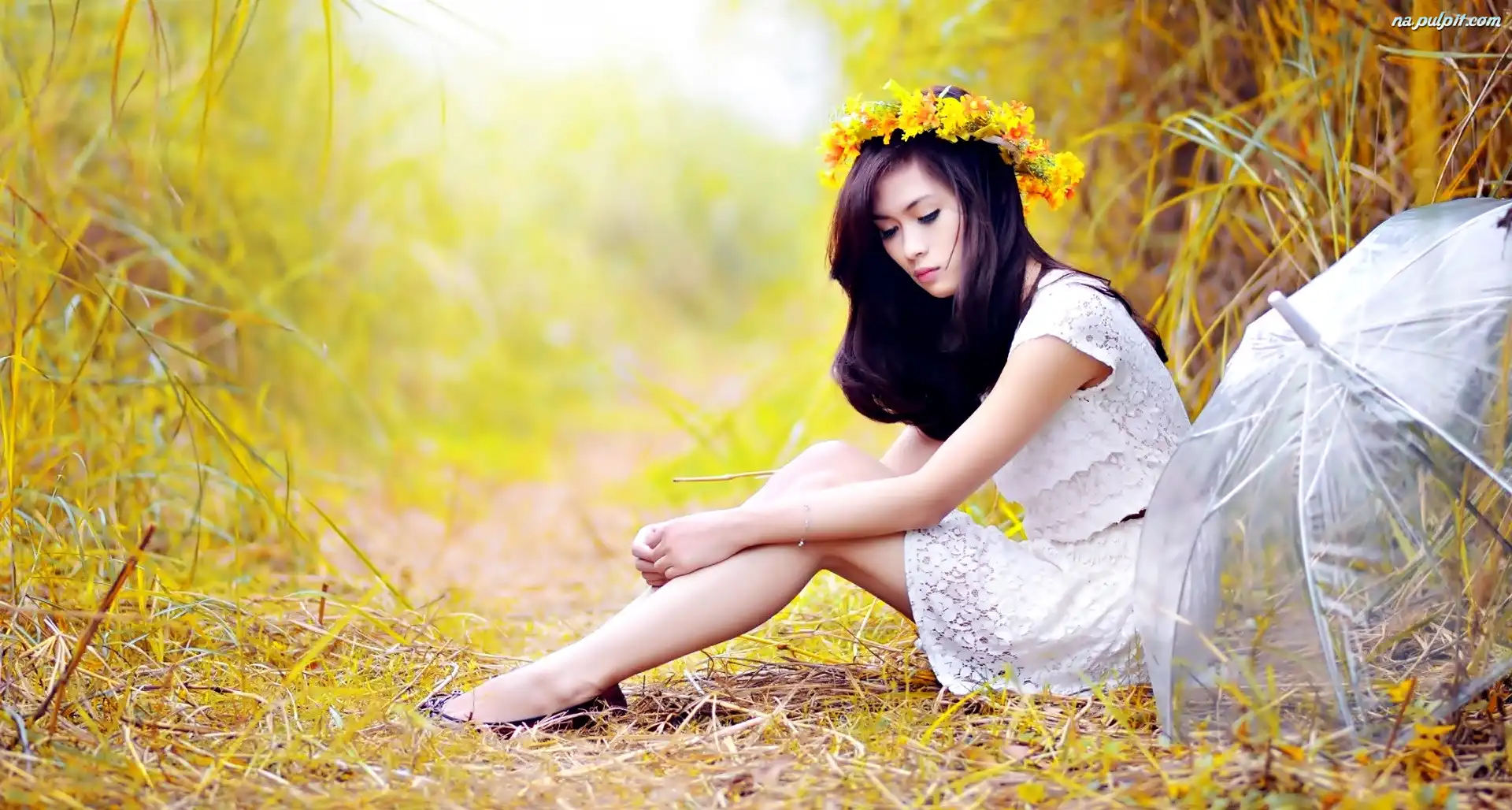 Parasol, Kwiaty, Żółte, Kobieta, Wianek