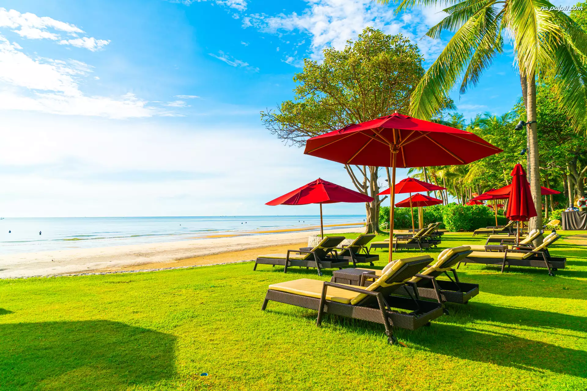 Drzewa, Lato, Leżaki, Parasole, Morze, Trawa Na Pulpit