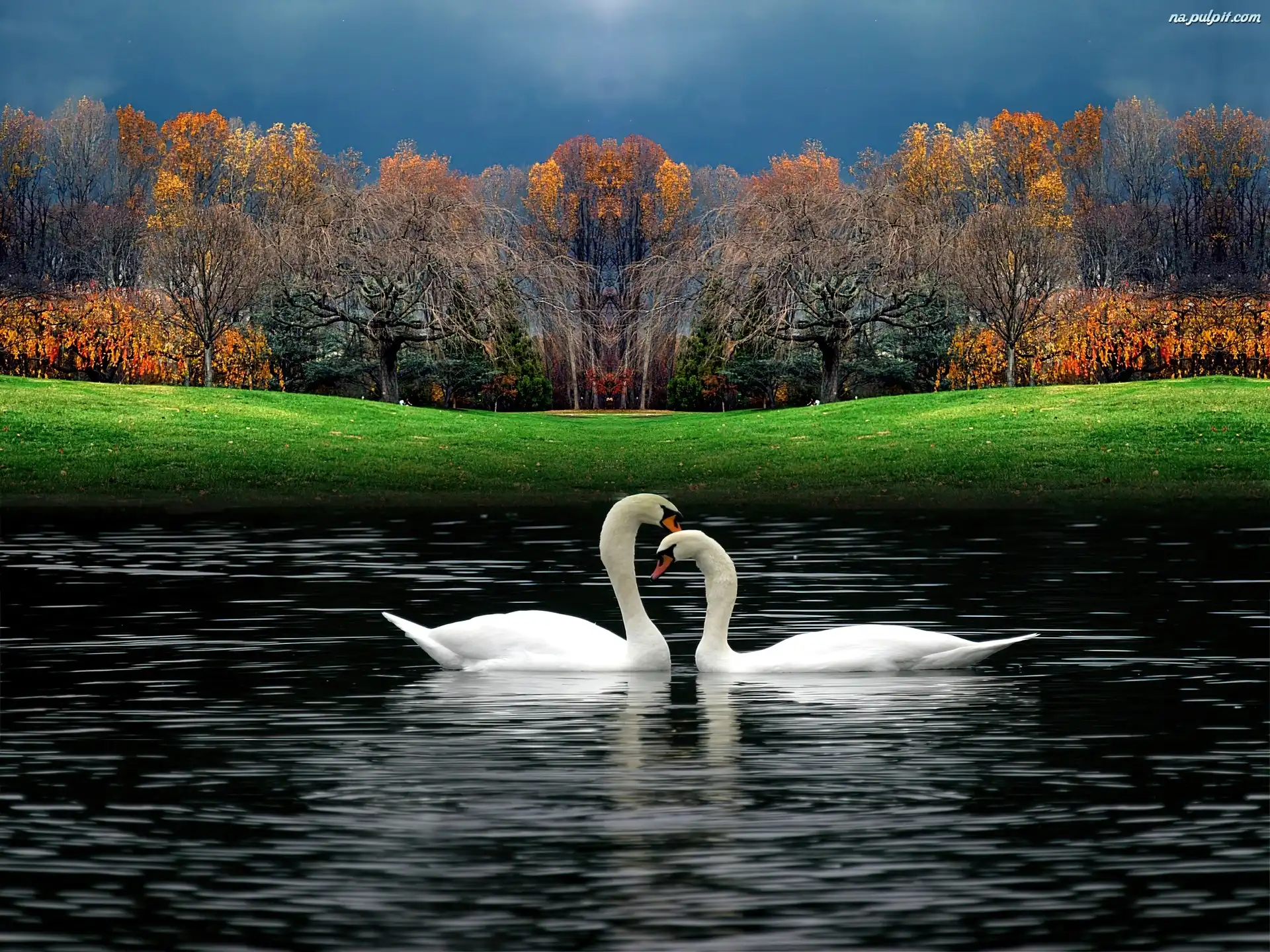 Park, Jezioro, Łabędzie, Trawa Na Pulpit