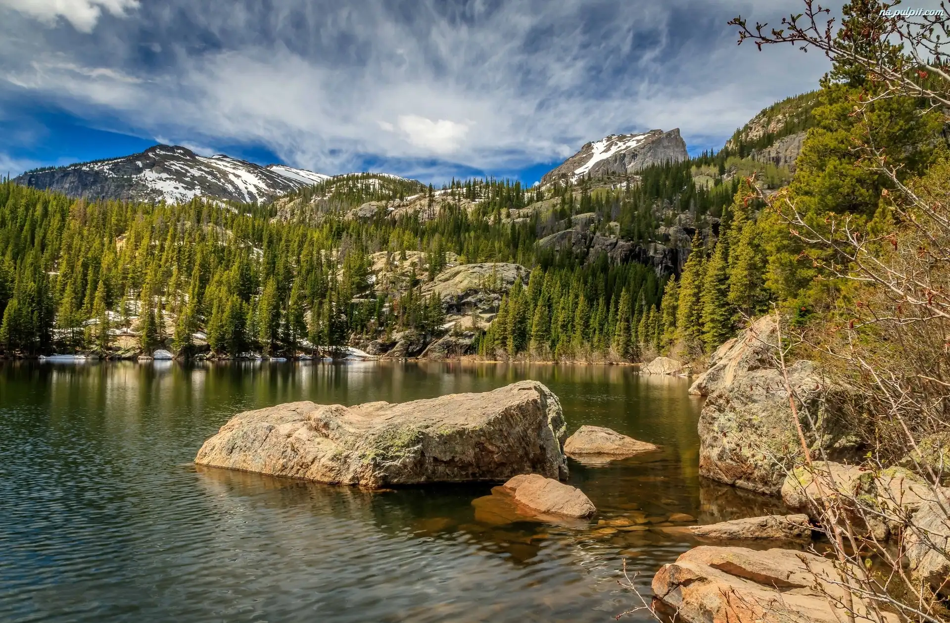 Park Narodowy Gór Skalistych, Drzewa, Świerki, Stan Kolorado, Stany Zjednoczone, Kamienie, Góry, Jezioro Bear Lake Na Pulpit |