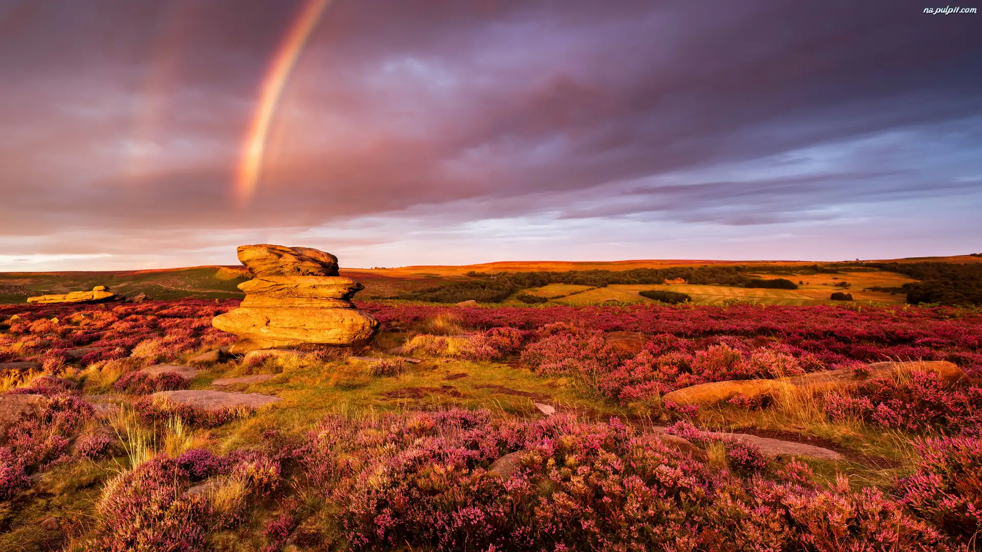 Park Narodowy Peak District, Wzgórza, Skały, Hrabstwo Derbyshire, Anglia, Zachód słońca, Wrzosowisko, Tęcza Na Pulpit |