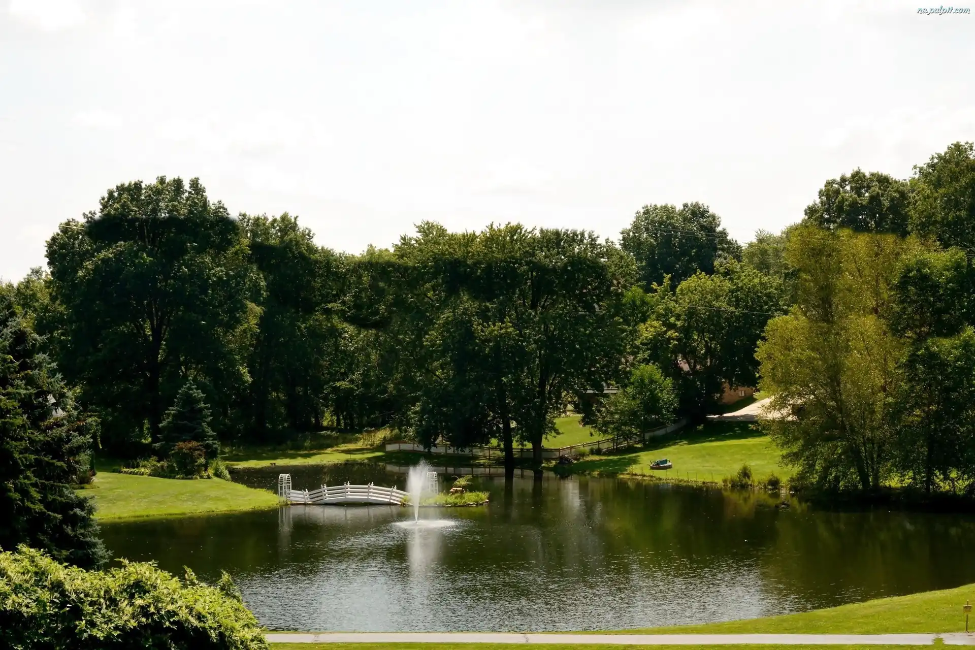Park, Mostek, Staw, Fontanna, Drzewa Na Pulpit
