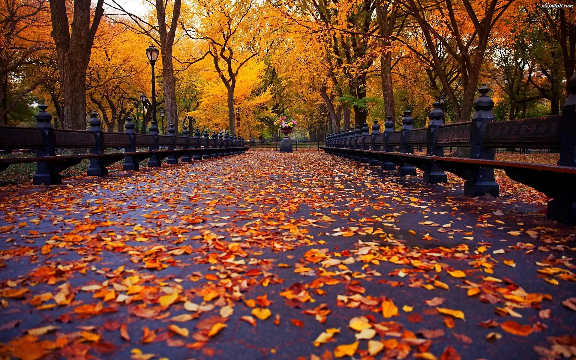 Park, Gazon, Kwiaty, Ławki, Jesień, Liście Na Pulpit