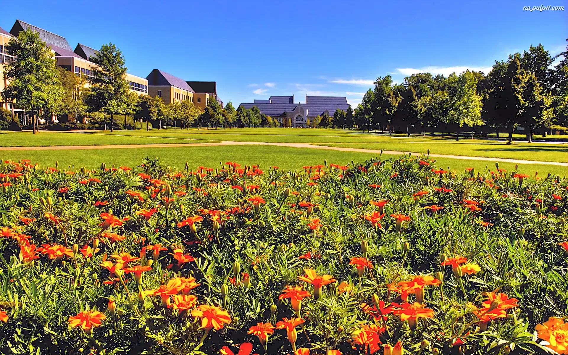 Park, Błękitne, Kwiaty, Budynki Na Pulpit