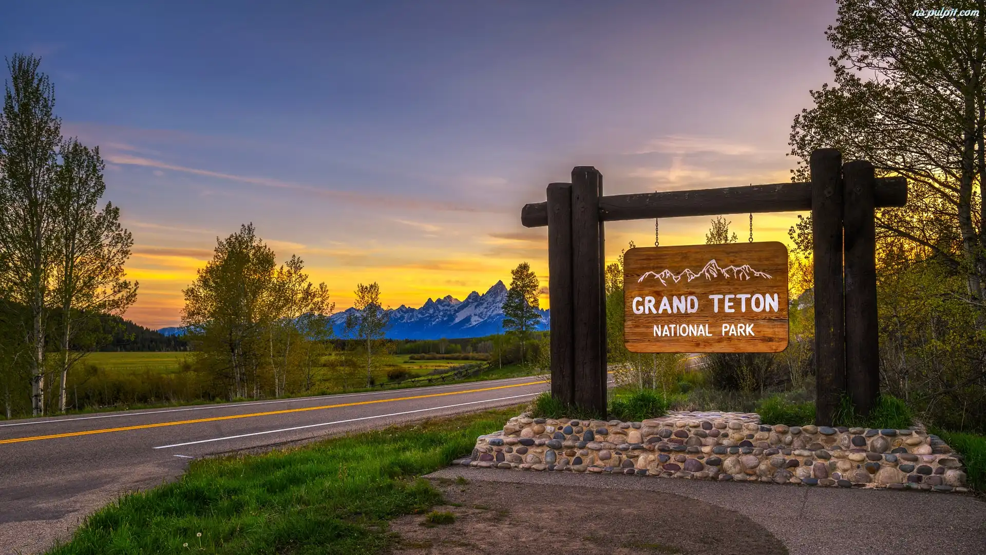 Tablica, Drzewa, Góry, Stany Zjednoczone, Wyoming, Park Narodowy Grand Teton, Droga