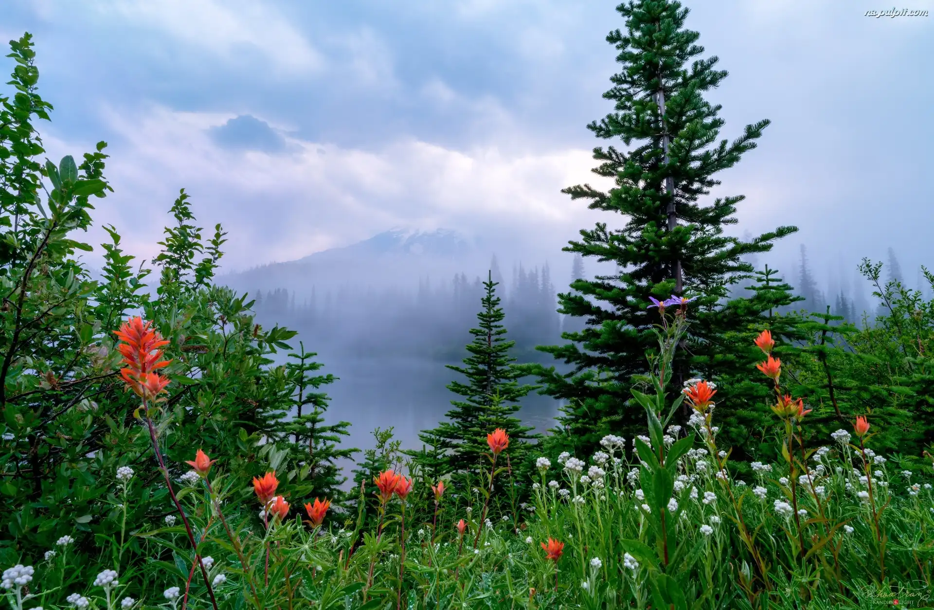 Mgła, Kwiaty, Łąka, Stany Zjednoczone, Waszyngton, Park Narodowy Mount Rainier, Drzewa