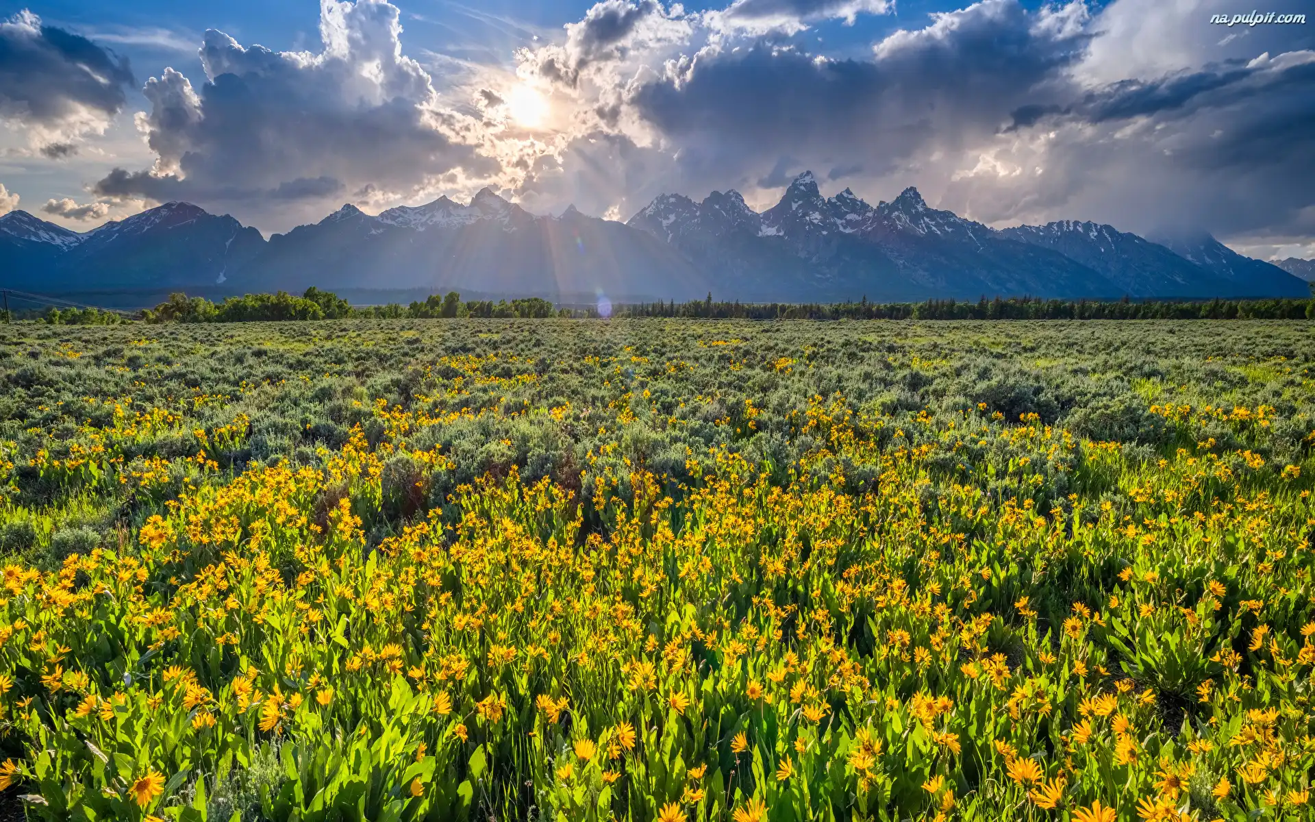 Kwiaty, Drzewa, Chmury, Park Narodowy Grand Teton, Stany Zjednoczone, Promienie słońca, Góry, Łąka Na Pulpit |