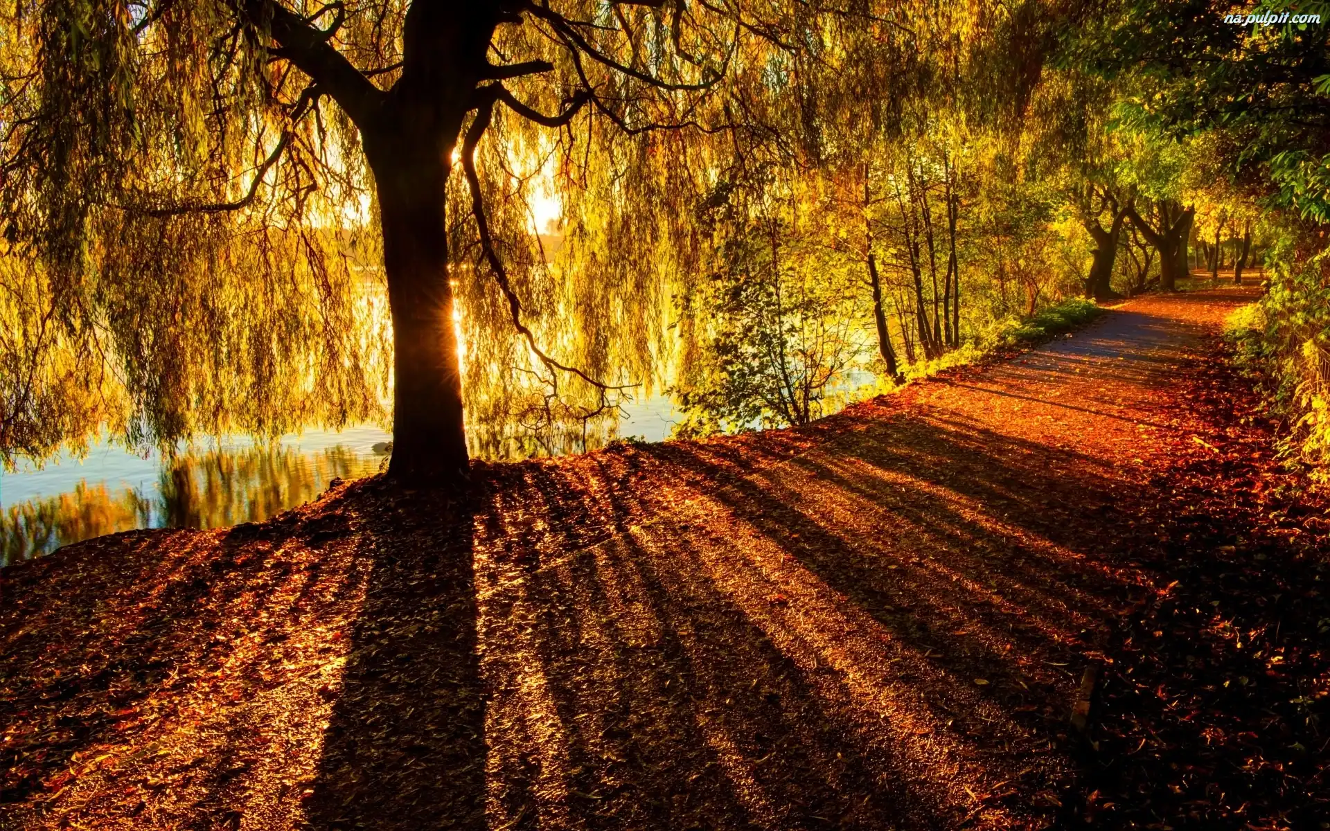 Park, Drzewo, Droga, Jesień, Przebijające światło Na Pulpit
