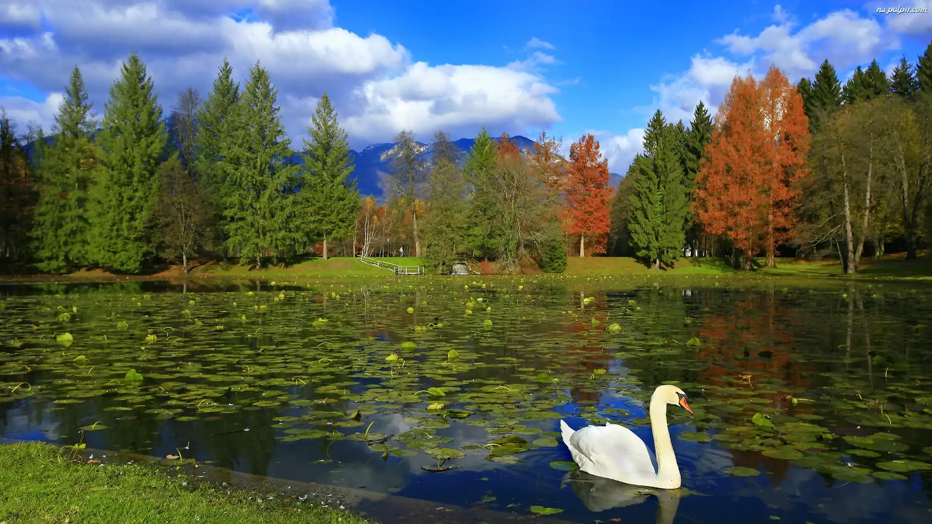 Łabędź, Staw, Park, Drzewa Na Pulpit