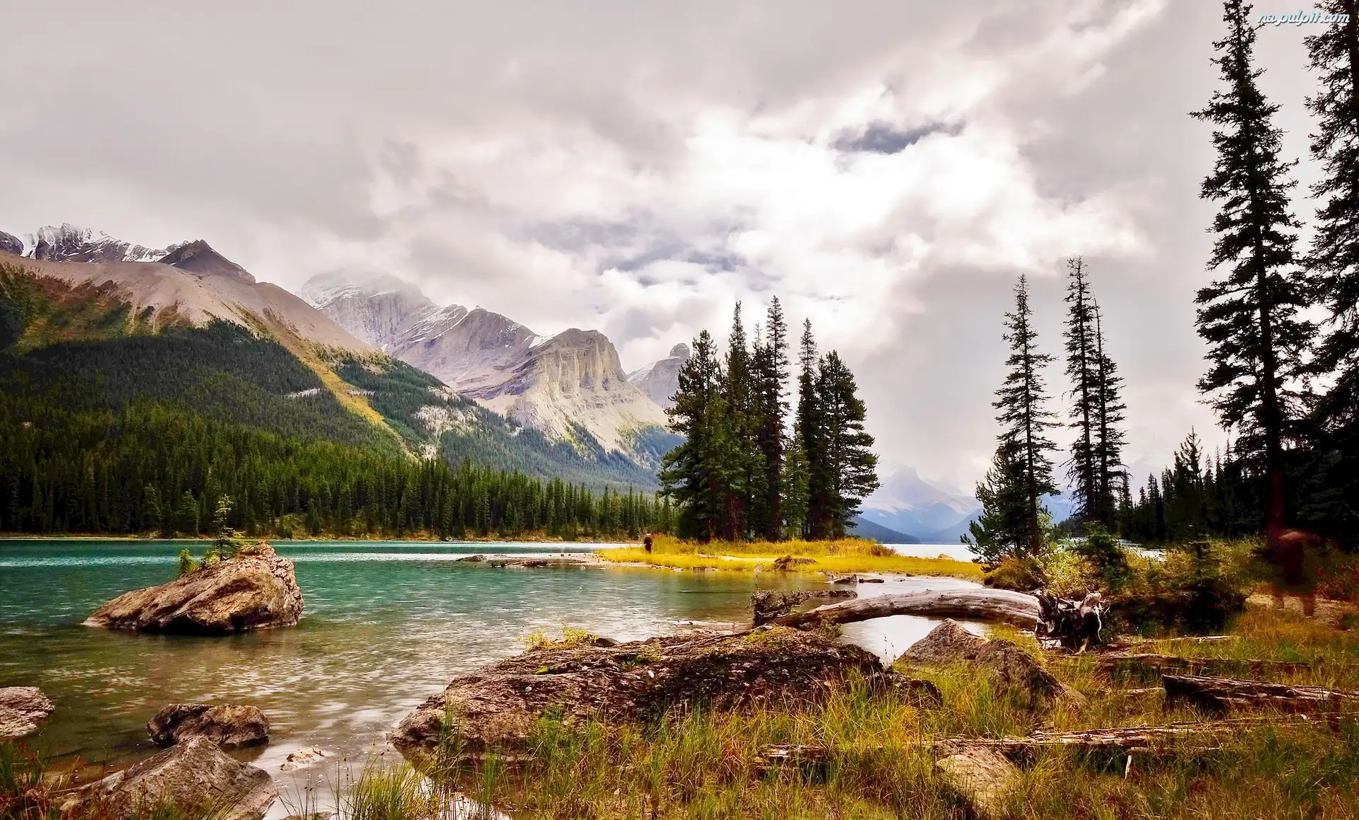 Wyspa Ducha, Kamienie, Góry, Park Narodowy Jasper, Chmury, Alberta, Kanada, Drzewa, Jezioro Maligne, Trawa Na Pulpit |