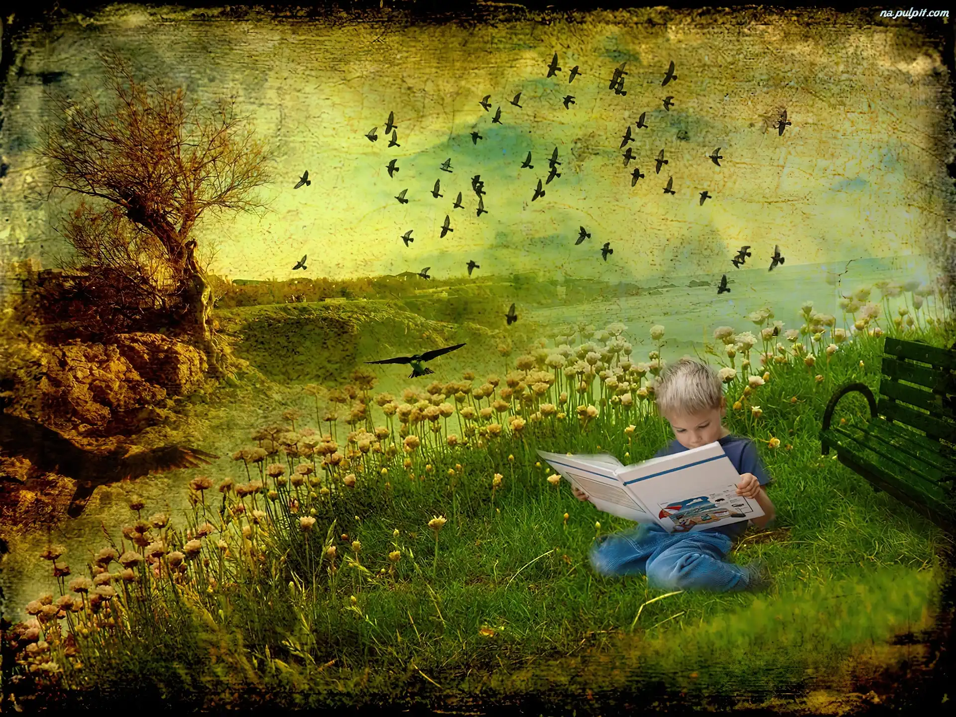 Łąka, Z, Chłopiec, Park, Książką Na Pulpit