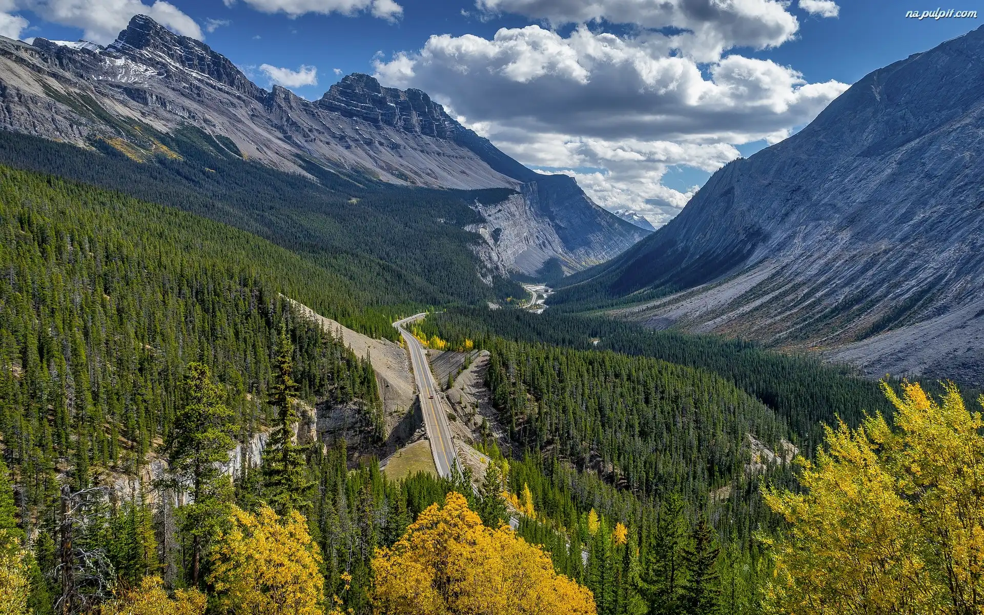 Drzewa, Dolina, Lasy, Alberta, Kanada, Droga, Góry Skaliste, Icefields Parkway Na Pulpit