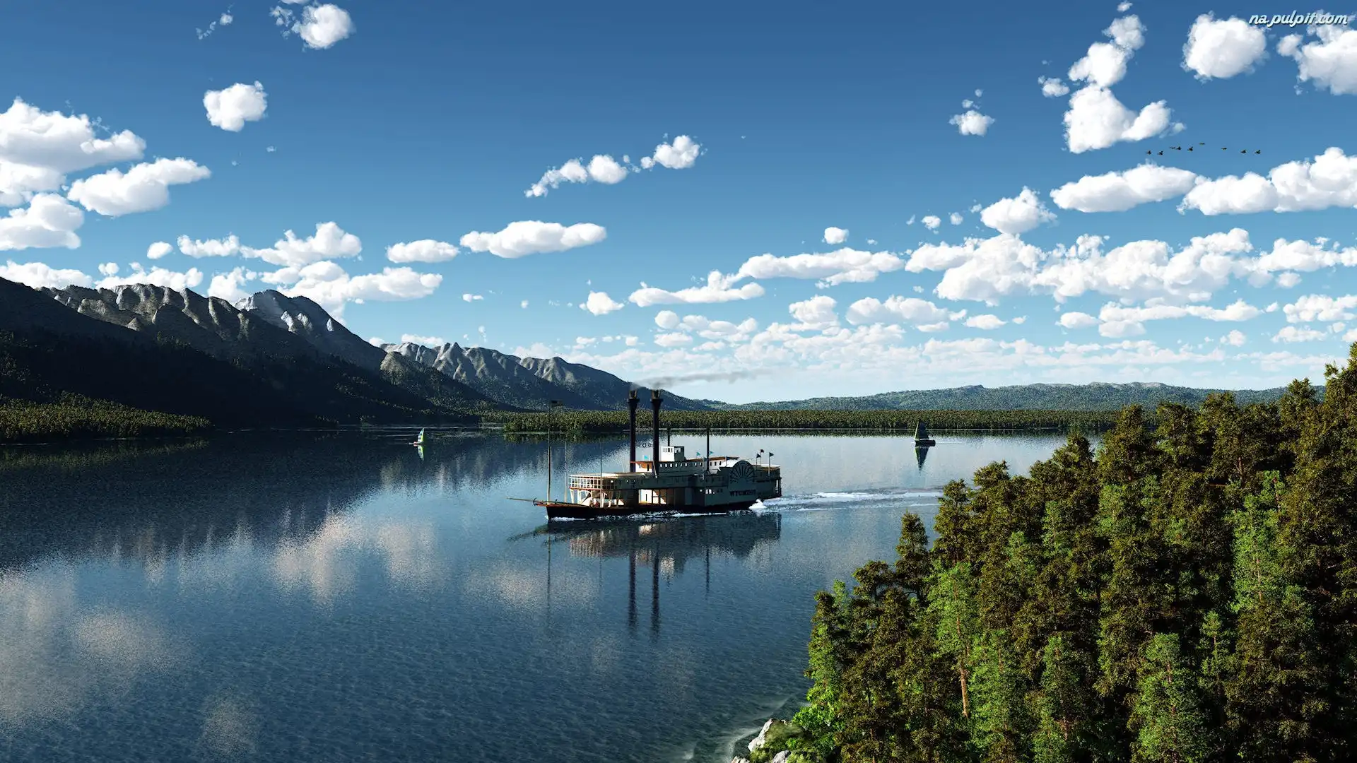 Parostatek, Góry, Niebo, Żaglówki, Jezioro, Drzewa Na Pulpit